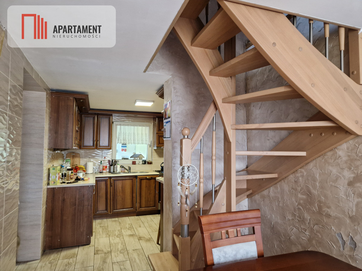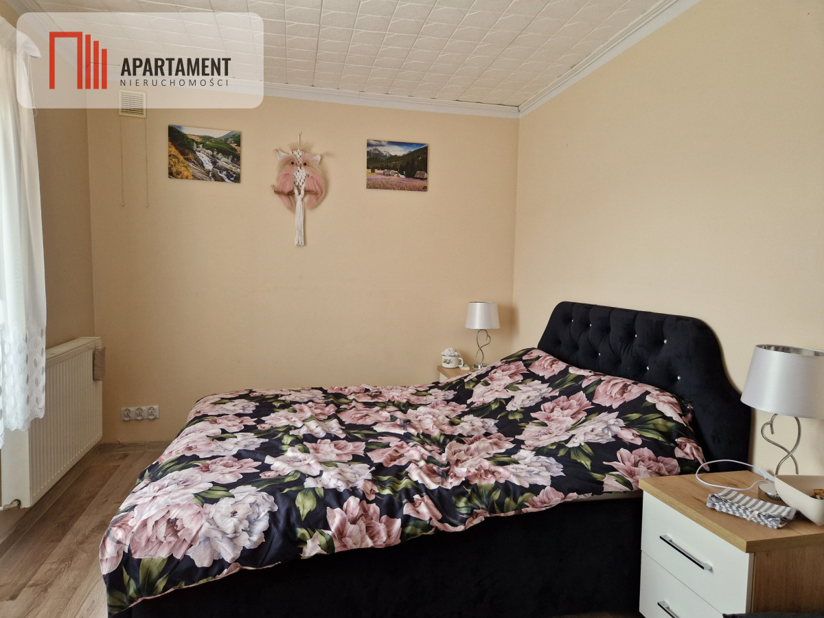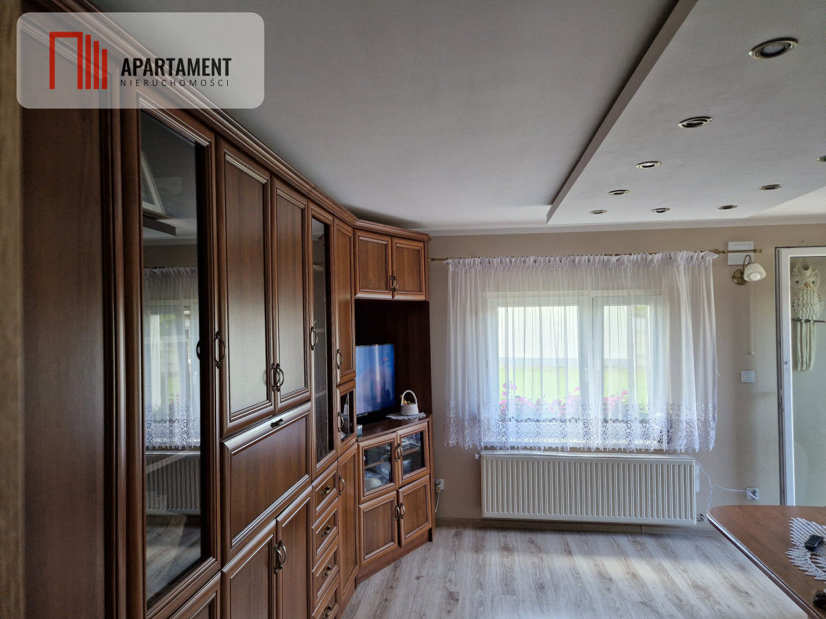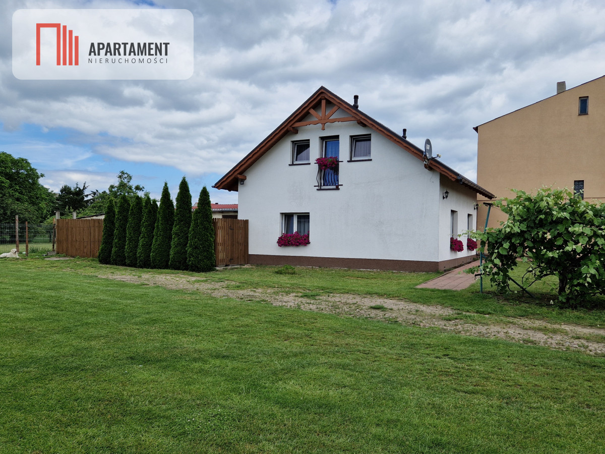 Pierwszy dom został gruntownie wyremontowany w 2018r. Ma powierzchnię 110m2 bez podpiwniczenia. Ściany budynku wykonane są z cegły i ocieplone styropianem o grubości 20cm. Wykonane ocieplenie styropianem o grubości 10cm pod wylewkę betonową podłogi. Dach nowy kryty blachodachówką z ociepleniem wykonanym pianą PUR. Okna plastikowe dwuszybowe. Dom bardzo energooszczędny. Na parterze znajduje się sypialnia(12,40mkw.), salon (22,36mkw) z wejściem z kuchni (6,35mkw.), łazienka (4,15mkw.), przedpokój (4,70mkw.). Na poddaszu znajdują się 2 pokoje, hol i łazienka. W ramach remontu całego budynku wykonano nową instalację elektryczną (400V) i centralnego ogrzewania z piecem na ekogroszek. Na podłogach w pokojach znajdują się panele, a w pozostałych pomieszczeniach płytki ceramiczne.