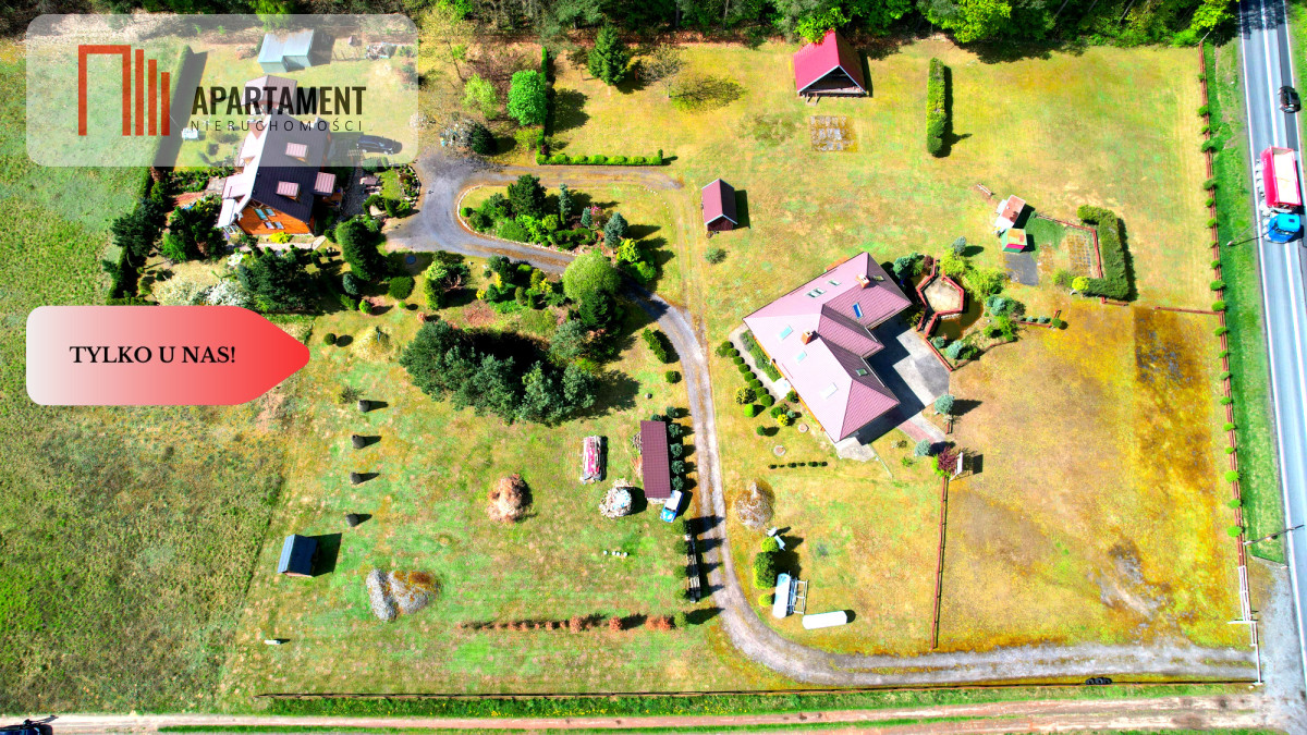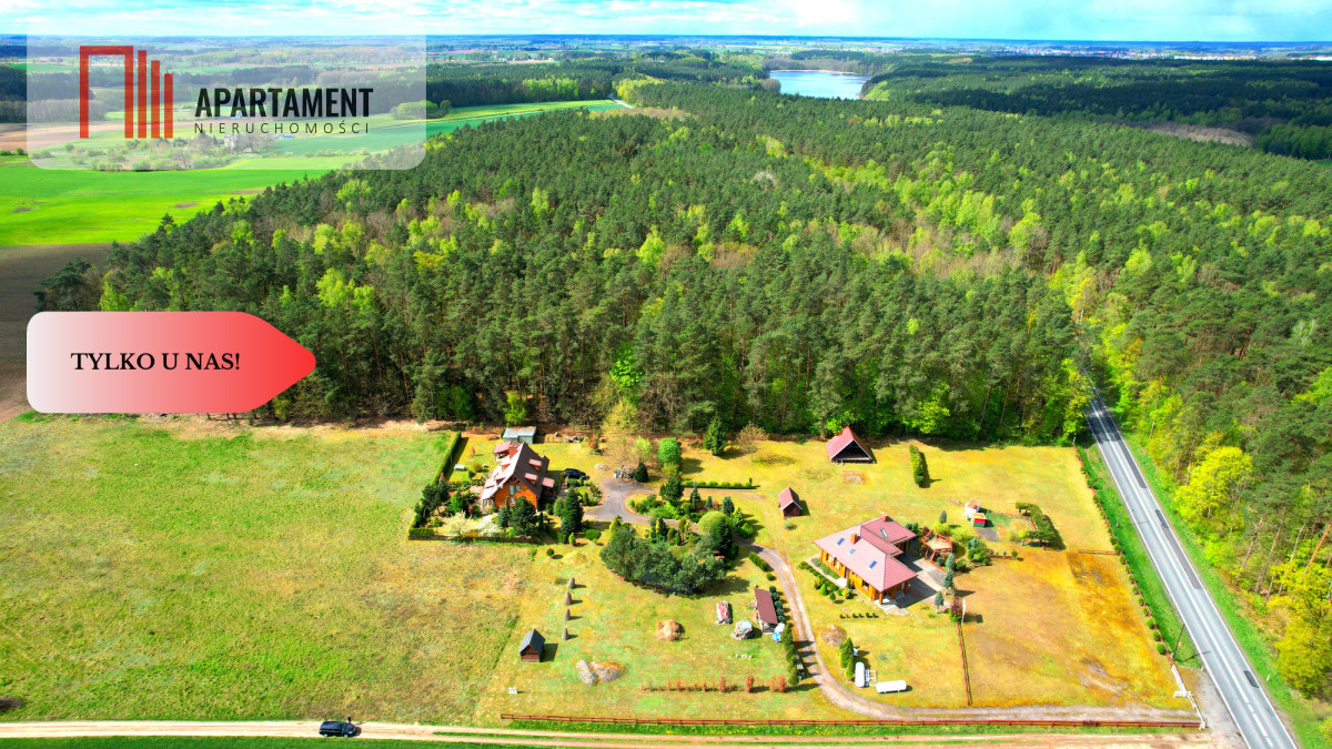 Tylko w naszym biurze. Przy drodze krajowej Dk25 urokliwa posiadłość na dwóch hektarach. Bardzo klimatyczna nieruchomość, przypominająca z wyglądu westernowe ranczo. Pięknie położona przy ścianie lasu z dużą działką przy ruchliwej drodze krajowej, ale w takiej odległości od nie, że nie jest to uciążliwe - budynek mieszkalny. Bardzo ładnie zagospodarowane otoczenie wokół domu, z licznymi nasadzeniami i oczkami wodnymi. Dom mieszkalny z bala whttps://youtu.be/y9QJuhK_jZ0?si=C4A-urBsoIy1TEtF eklektycznym stylu z dużym tarasem i pokojem zimowym. Drugi budynek z w pełni wyposażonym lokalem gastronomicznym, duże zaplecze, kuchnia i przestrzenią mieszkalną na piętrze. Oferta skierowana do konesera - miłośnika koni, natury, tego typu posesji, biznesowo idealny materiał na zajazd z małą (na dzień dzisiejszy) baza noclegową. Duży potencjał rozwojowy lub inwestycyjny z uwagi wielkość działki i lokalizację. Klasa gruntu 5i 6 daje możliwość wydzielenia mniejszych działek budowlanych. Poniżej link do filmu z oblotu dronem