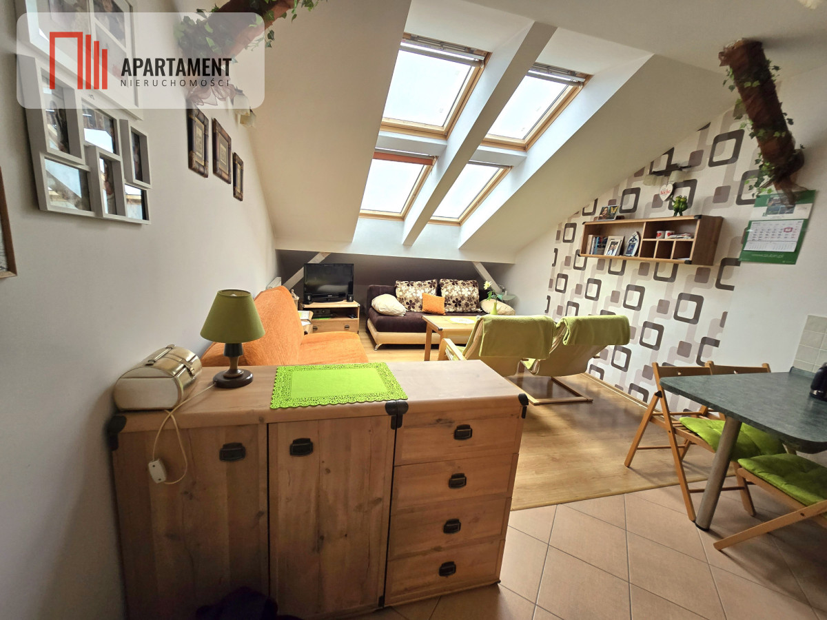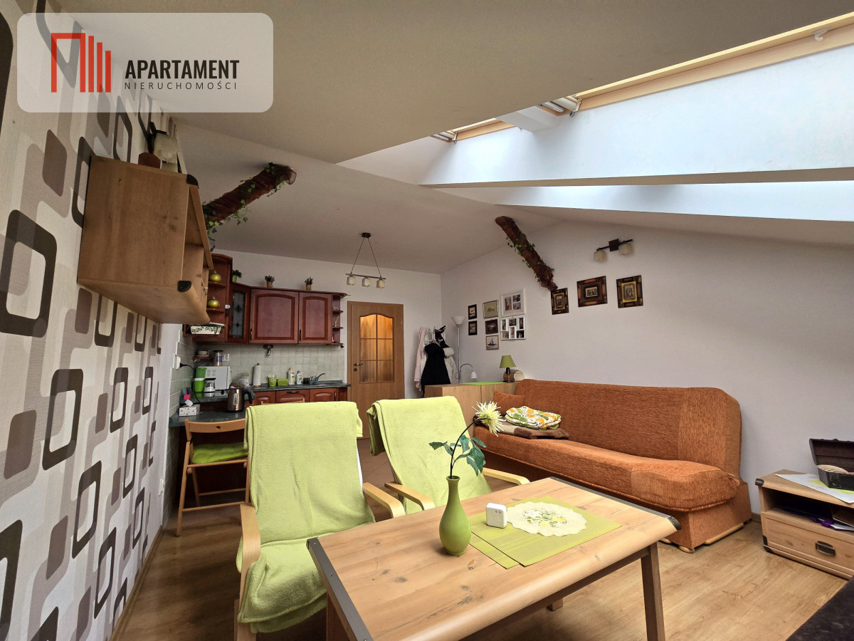 Salon z aneksem kuchennym: Jasne wnętrze o funkcjonalnym układzie. Okna dachowe zapewniają dużo naturalnego światła, a wykończenie wnętrza nadaje przytulnego charakteru.