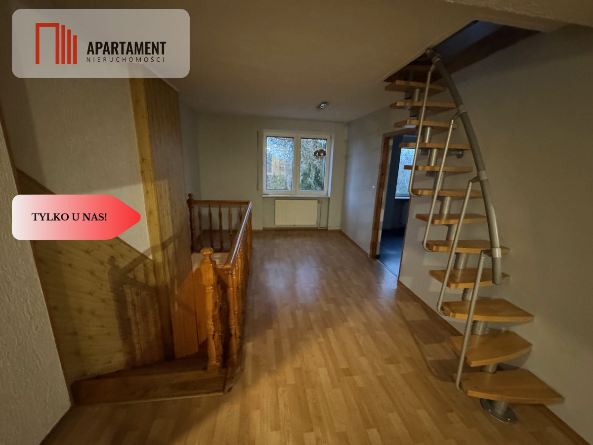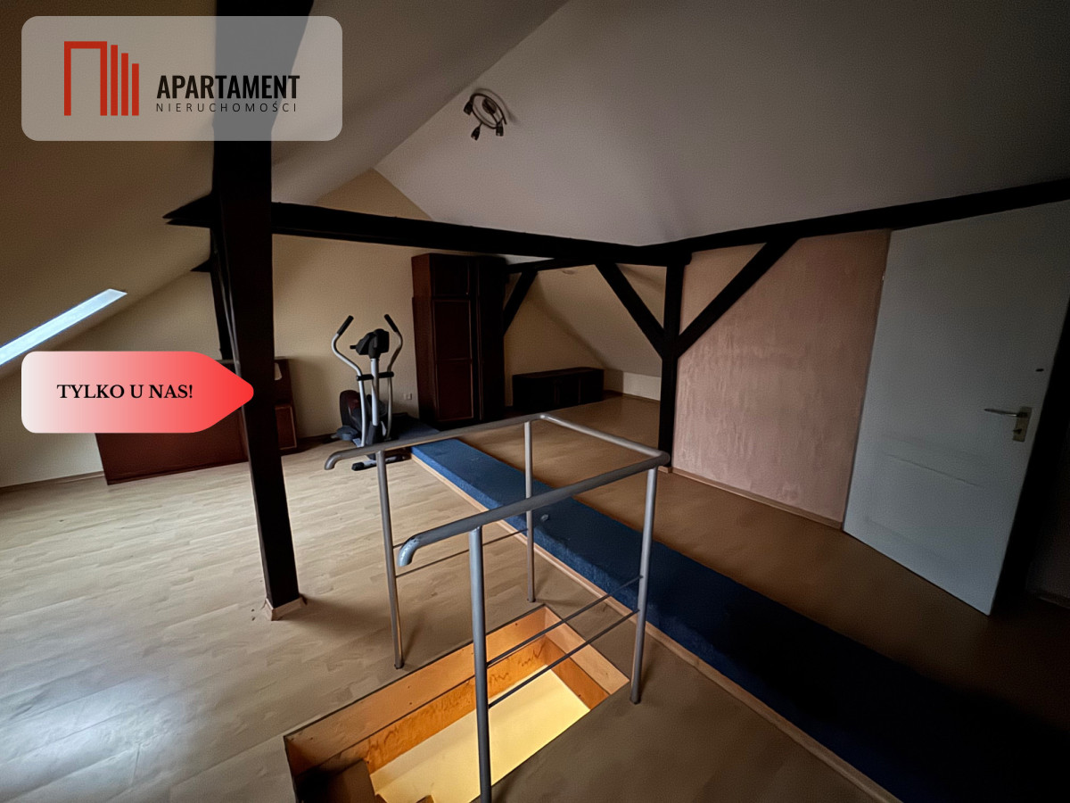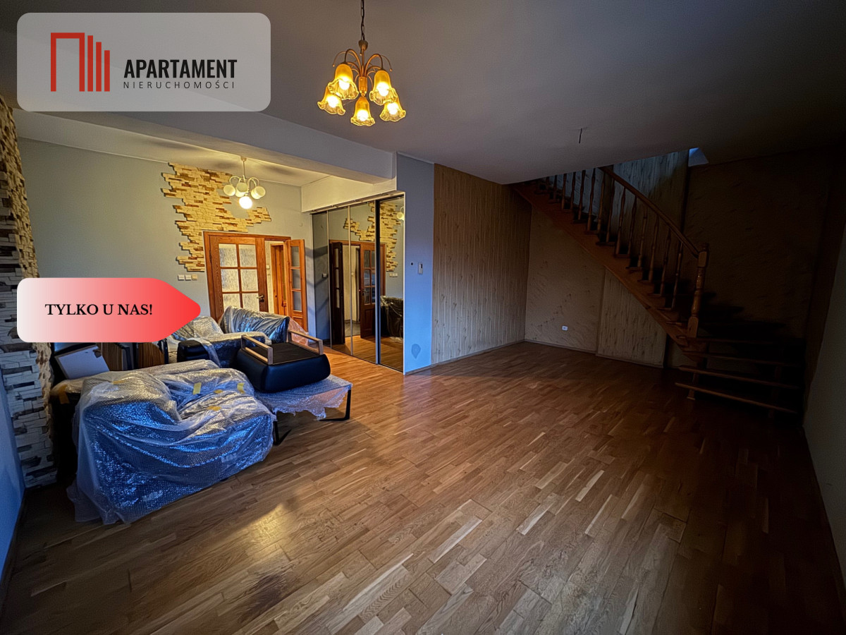 Na sprzedaż połowa domu o powierzchni ok. 150 m2 z możliwością podzielenia na dwa mieszkania. Budynek składa się z trzech kondygnacji i posadowiony jest na działce o pow. 835 m2. Do domu przynależy osobne wejście poprzez dość spory taras. Przy wejściu domofon. Wchodząc do domu przechodzimy przez wiatrołap, do dużego przestronnego salonu z wykonaną na wymiar szafą pod zabudowę. Na parterze znajduje się jeden pokój, może służyć jako gabinet, łazienka z WC oraz pomieszczenie gospodarcze. Podłoga została wyłożona panelami, ściany wykończone gładzią szpachlową i pomalowane. Na ścianach zostały wykonane elementy dekoracyjne z płytek imitujących piaskowiec. W pokoju, łazience i przedpokoju podłogi oraz częściowo ściany zostały wykończone płytkami. Na piętro prowadzą ażurowe schody wykonane z drewna. Na tym piętrze znajduje się przestronna w pełni umeblowana i wyposażona kuchnia z salonem, dwa pokoje oraz łazienka z WC. Trzeci poziom to duże, przestronne poddasze użytkowe z możliwością podzielenia na kilka pokoi. Dodatkowo obok znajduje się nieużytkowy strych. Powierzchnia całkowita domu to ok. 150 m2 ( parter 63 m2 + piętro 61,5 m2 + poddasze użytkowe ok. 25 m2).