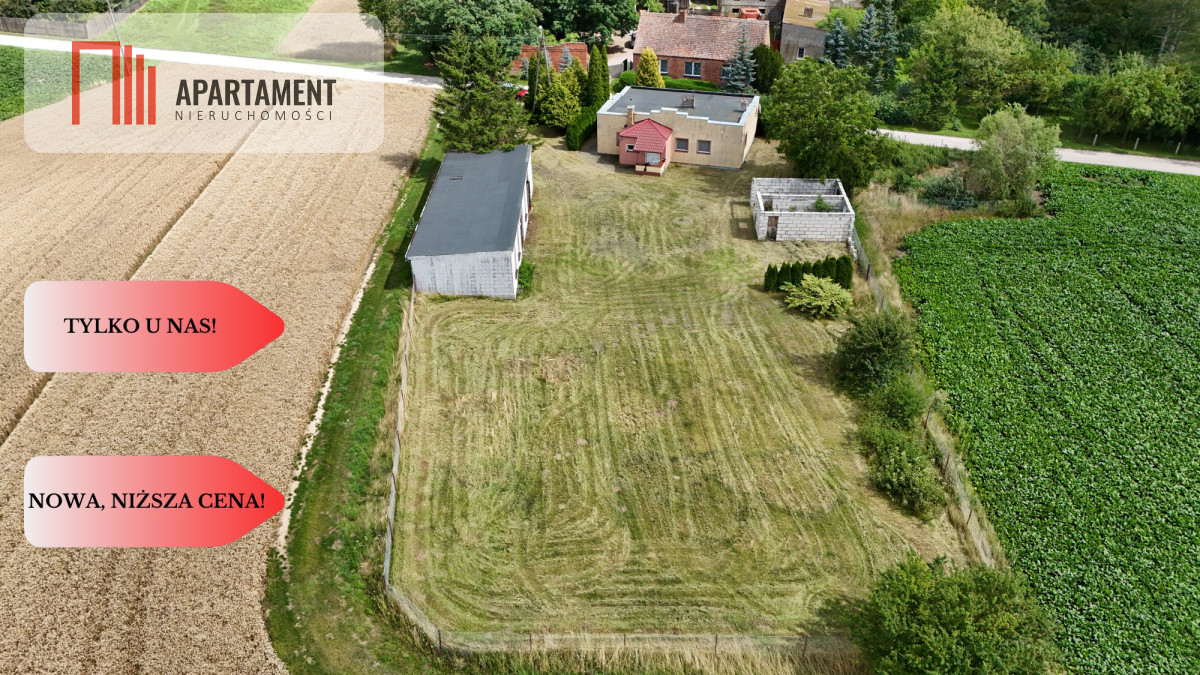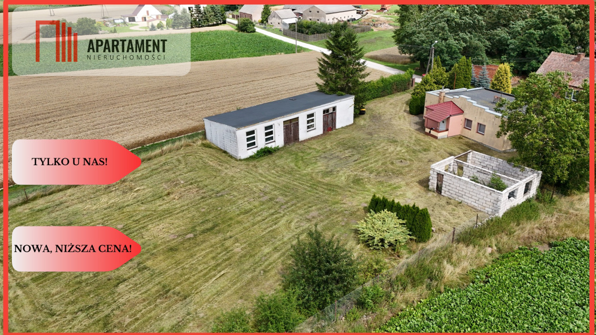 Nieruchomość na dużej działce 2200m2 zabudowana domem wolnostojącym, parterowym o powierzchni użytkowej 100m2 , budynkiem warsztatowym o powierzchni użytkowej 102m i rozpoczętą budową garażu z pomieszczeniem gospodarczym.
