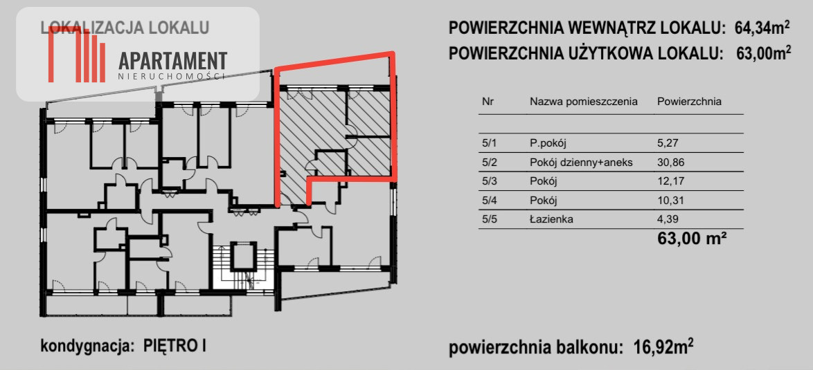 Mieszkanie o powierzchni użytkowej 63,0 m² zostało zaprojektowane z dbałością o każdy detal, zapewniając przestronność oraz funkcjonalność. W skład lokalu wchodzą: