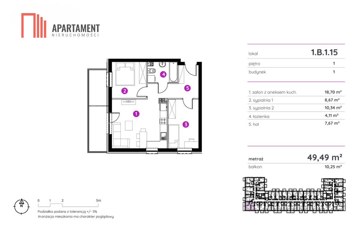 Wnętrze mieszkania jest funkcjonalnie zaprojektowane, oferując jasną strefę dzienną z aneksem kuchennym sypialnia, gabinet/sypialnie oraz komfortową łazienkę. Duże okna zapewniają doskonałe doświetlenie, a nowoczesne materiały wykończeniowe gwarantują wysoki standard życia.