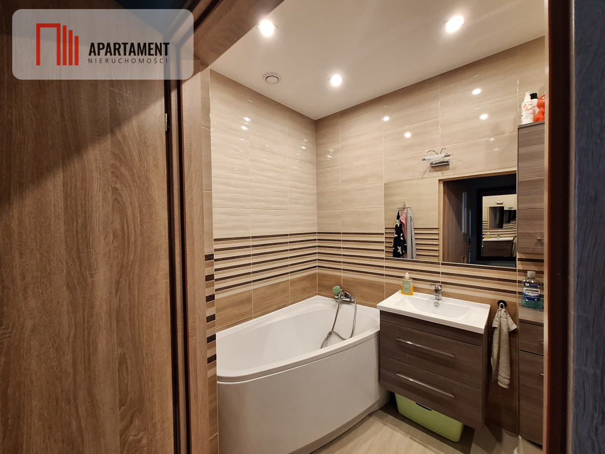 Mieszkanie składa się z salonu z aneksem kuchennym (31,28m2), dwóch sypialni 14,86m2, oraz 15,44m2, łazienki z wanną (4,60m2) i przedpokoju (5,09m2). Kuchnia w zabudowie wraz całym sprzętem pozostaje do dyspozycji kupującego. Mieszkanie posiada balkon oraz przynależy do niego piwnica (3,14m2).
