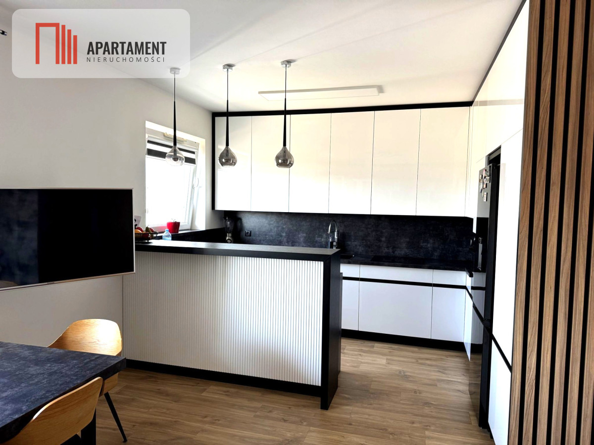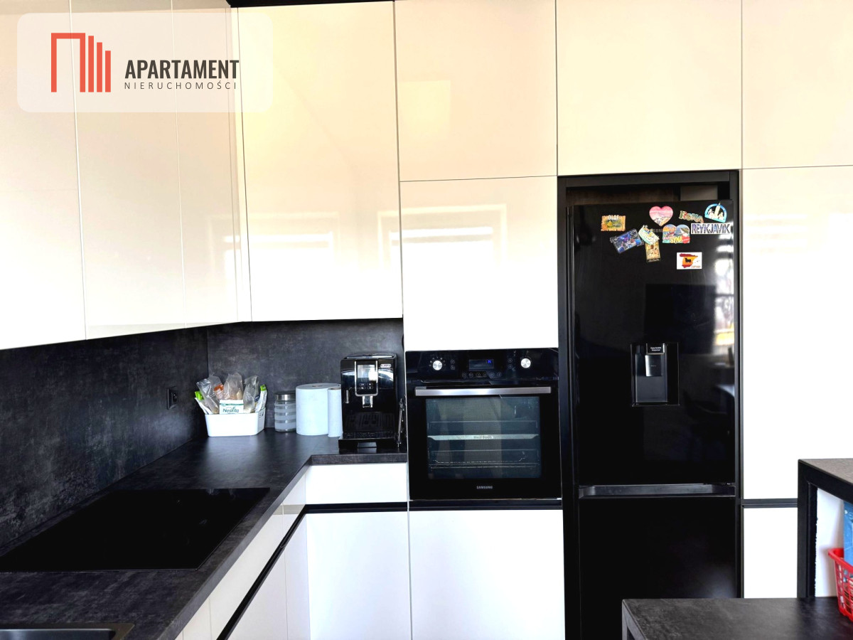 Salon z aneksem kuchennym- 26m2 nowoczesna zabudowa kuchenna wykonana na zamówienie. W cenie sprzęty AGD lodówka, zmywarka, okap, płyta indukcyjna, piekarnik.