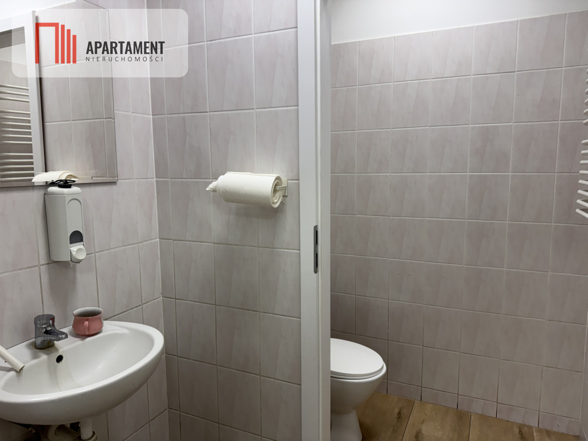 Na terenie lokalu znajdują się również wydzielona przestrzeń socjalna oraz toalety, co zapewnia komfort codziennego użytkowania.