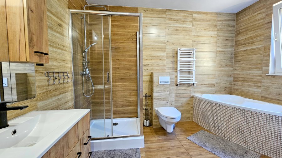 Polecamy Państwu DOM WOLNOSTOJĄCY o powierzchni użytkowej: 125 m2, całkowitej: 140 m2 oraz GARAŻ WOLNOSTOJĄCY o powierzchni: 24 m2, położony na działce o powierzchni: 429 m2 k/Goleniowa. Dach dwuspadowy pokryty blachodachówką. Budynek 2-kondygnacyjny. Na parterze znajdują się: duży salon (pokój dzienny), sypialnia, kuchnia ze strefą jadalnianą, łazienka, korytarz, pomieszczenie gospodarcze (kotłownia) oraz wiatrołap (ganek). Na poddasze prowadzą schody drewniane, gdzie znajdują się: 3 sypialnie oraz przedpokój. Dodatkowo zostały wyprowadzone media z możliwością zrobienia drugiej łazienki lub kuchni. W pokoju dziennym (salonie) oraz sypialniach na podłogach położone są: panele podłogowe; ściany gładzone, malowane, regipsy; w salonie częściowo płytki dekoracyjne (piaskowiec). Łazienka z WC, wykończona glazurą i terakotą; wyposażenie: kabina prysznicowa, wanna narożna, meble łazienkowe z lustrem, umywalka, grzejnik drabinkowy oraz pralka. W kuchni na podłodze terakota; ściany: gładzone malowane oraz pas glazury; wyposażenie: meble kuchenne, kuchenka gazowa z piekarnikiem, zmywarka, okap, kuchenka mikrofalowa. Na korytarzu na podłodze: terakota; ściany: płytki dekoracyjne (piaskowiec). Wiatrołap (ganek), na podłodze: gres; ściany: gładzone, malowane. Okna PVC. Ogrzewanie oraz źródło c. w.: piec c.o. z podajnikiem na eko-groszek oraz instalacja paneli fotowoltaicznych. Media: prąd, woda, kanalizacja miejska, szybki internet (światłowód). Teren wokół domu zagospodarowany.Obok domu znajdują się: murowany garaż wolnostojący o powierzchni: 24 m2 oraz wiata. Dom gotowy do zamieszkania. Polecamy z uwagi na lokalizację, układ, niskie koszty utrzymania, lokatę kapitału jako inwestycję w nieruchomości, możliwości zarobkowe (wynajem) oraz atrakcyjną cenę do negocjacji. Istnieje możliwość zamiany na mieszkanie z dopłatą. Polecamy i Zapraszamy na Prezentację.