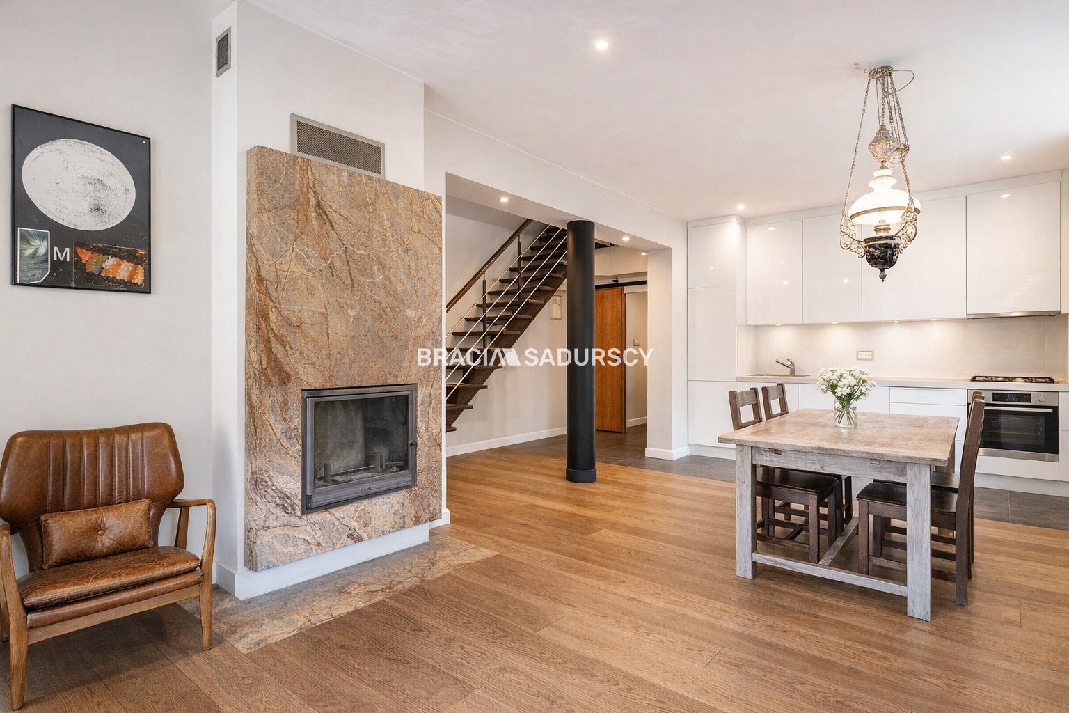 - obszerna przestrzeń kuchenna z zabudową po sufit i wyjściem na duży, drewniany, naturalny taras (bankier, 25 mkw) oraz kominek (z rozprowadzeniem ciepła do pomieszczeń na piętrze). W kuchni do dyspozycji użytkowników zmywarka, lodówko-zamrażarka, piekarnik, płyta gazowa (sprzęt marek Miele, AEG), na podłodze śliczny łupek.