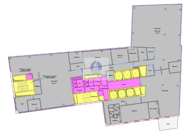 Układ piętra pozwala na elastyczne zaplanowanie funkcji biura zarówno w formule open space, jak i z wyraźnym podziałem na strefy pracy zespołowej, gabinety, sale konferencyjne, pomieszczenia focus / quiet rooms, zaplecze socjalne i techniczne.