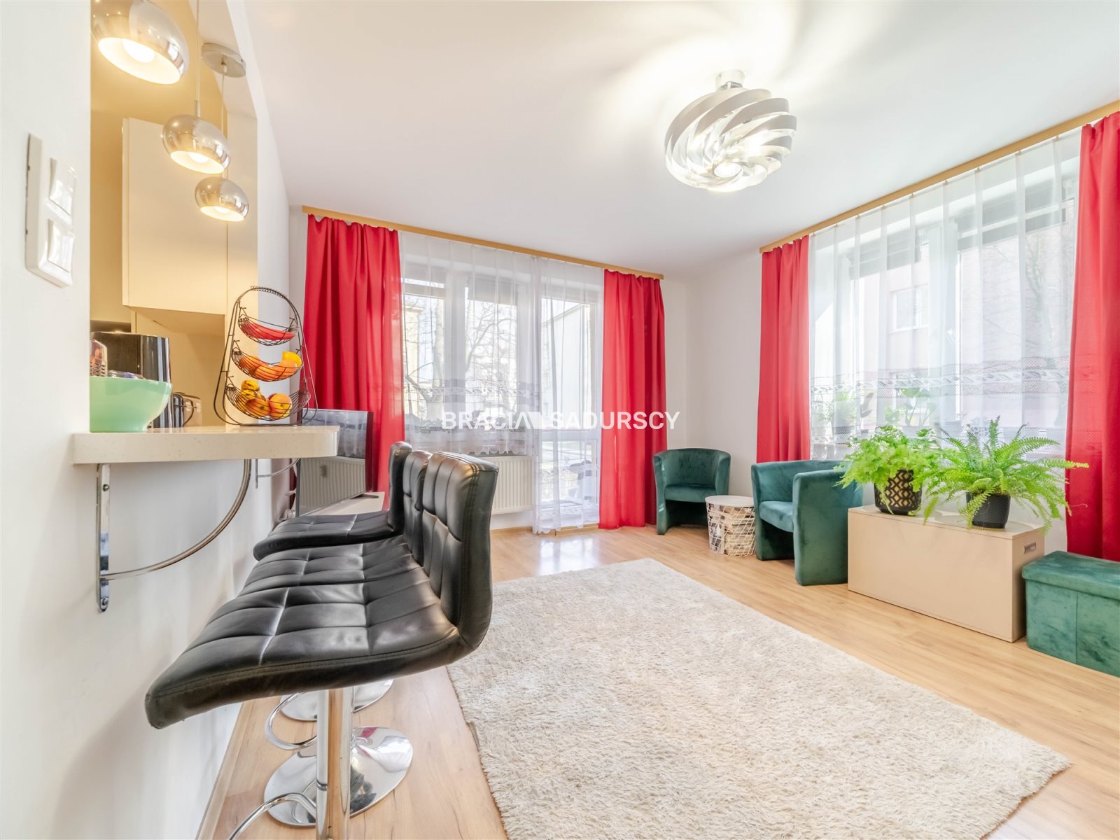 Mieszkanie znajduje się na parterze i jest unikatowe ponieważ położone jest na dwóch poziomach. Na poziomie 0 znajduje się przedpokój, piękny duży salon, aneks kuchenny i sypialnia. Z sypialni schodzi się na poziom -0,5 na którym znajduje się gabinet i pomieszczenie gospodarcze. Doskonałe rozwiązanie dla osób potrzebujących spokoju do pracy podczas gdy na górze toczy się życie towarzyskie lub rodzinne.