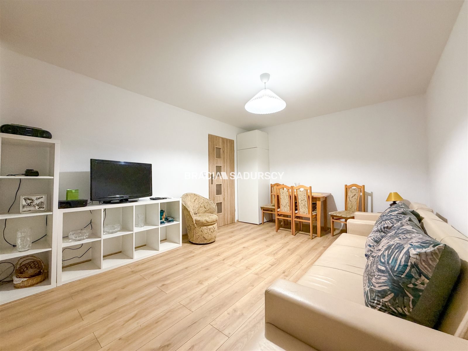 - Salon (odświeżony/wyremontowany): rozkładana skórzana sofa, fotele, stół z krzesłami, TV, dużo miejsca do przechowywania.