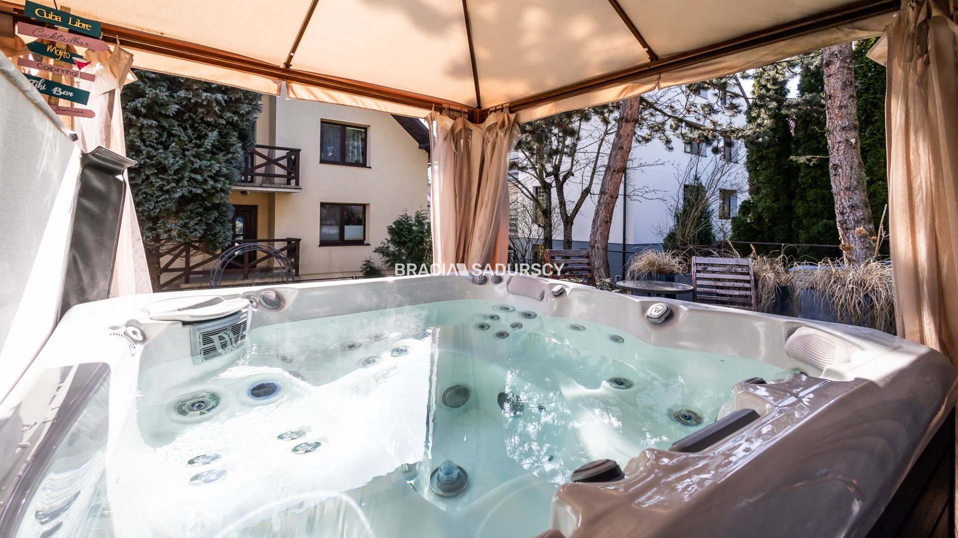 Z pomieszczenia z sauną wyjście na taras na którym umiejscowione jest jacuzzi ogrodowe.