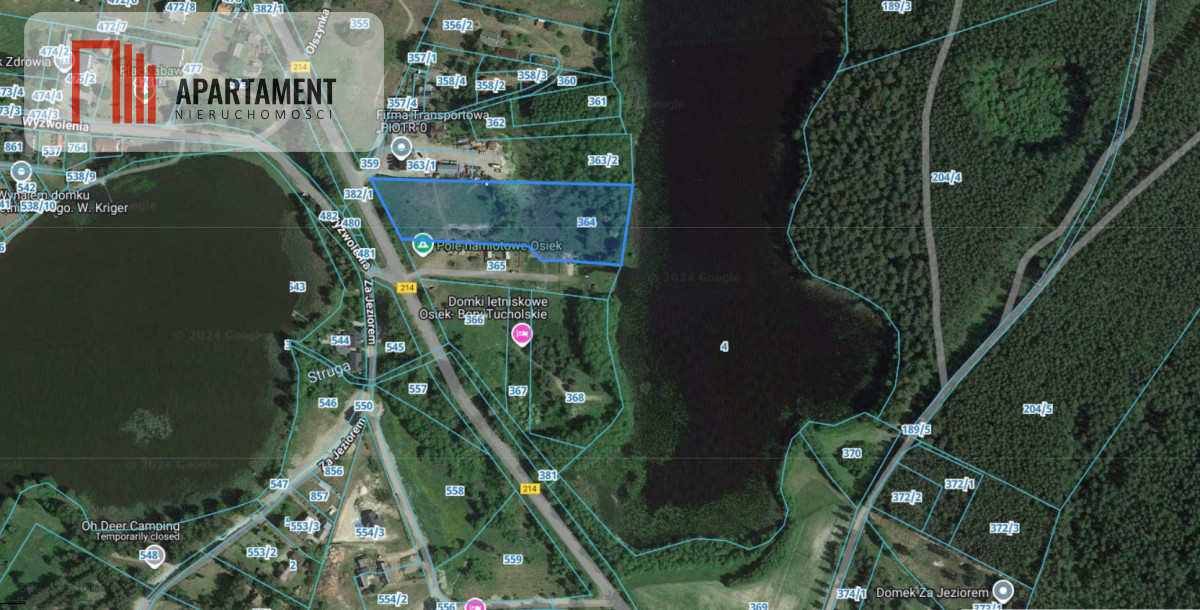 Biuro Nieruchomości Apartament ma zaszczyt zaprezentować Państwu na sprzedaż Unikatową Działkę pod zabudowę turystyczno-usługową z linia brzegową(nr 364)o powierzchni 10197m2 zlokalizowaną na połączeniu dwóch jezior(Kałębie i Czarne) miejscowości turystycznej wsi Osiek