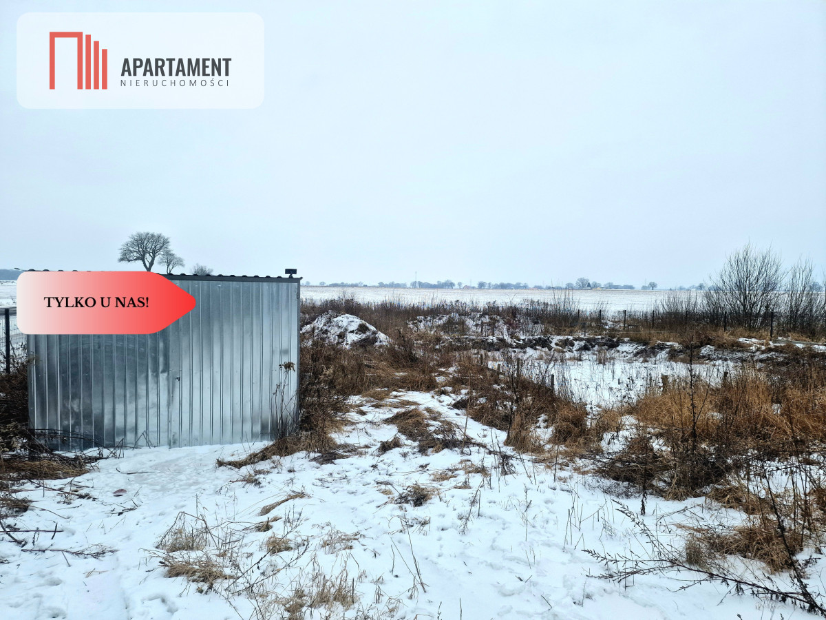 Teren jest ogrodzony, a na działce znajduje się garaż blaszany, który może pełnić funkcję zaplecza budowy lub miejsca do przechowywania.
