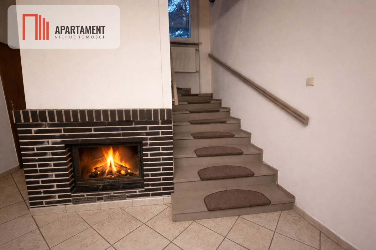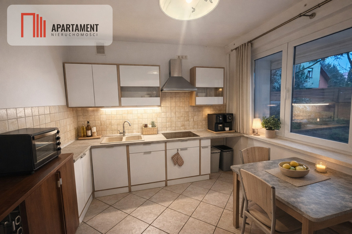 Kuchnia z salonem w którym znajduję sie kominek - przestronna kuchnia połączona z salonem i jadalnia. Ogród z zadaszonym tarasem.