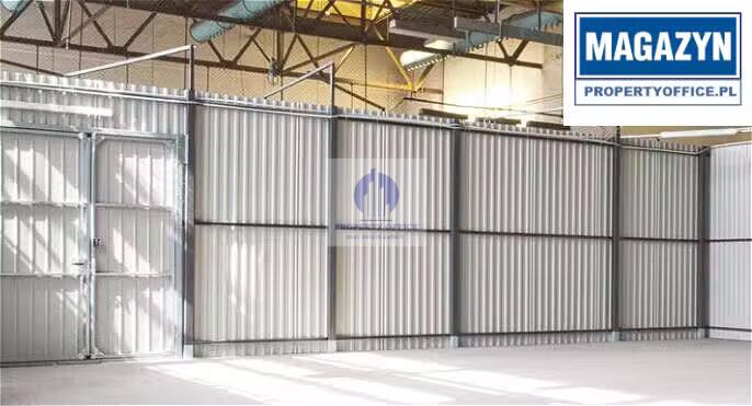 Magazyn wewnątrz dużej hali magazynowej, blisko brany wjazdowej.