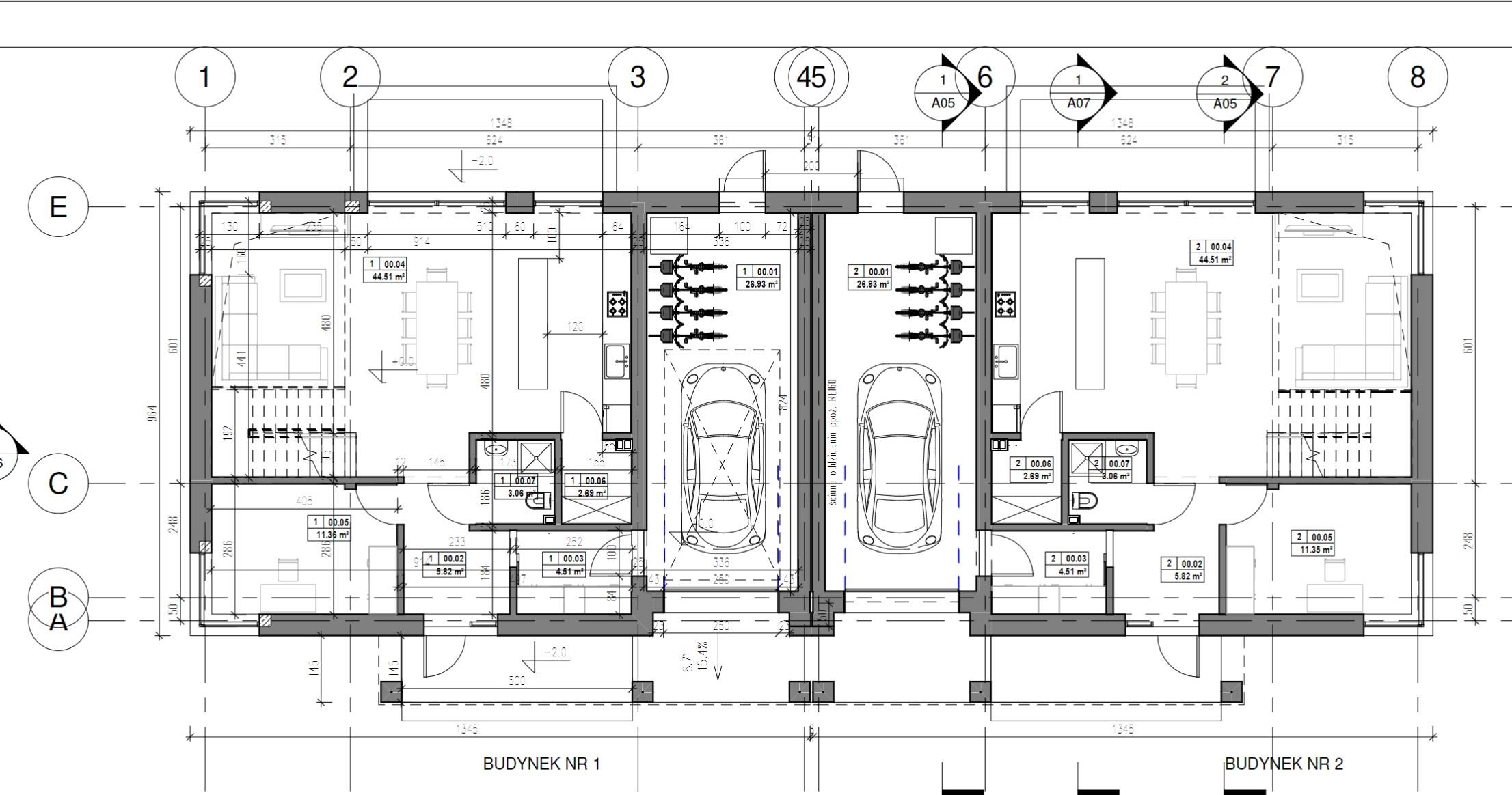 Salon 44,51m2 z aneksem kuchennym z oknem z wyjściem na ogród, gabinet 11,36m2, spiżarka 2,69, łazienka 3,06 ,garderoba 4,51m2, wiatrołap 5,82, garaż 26,93