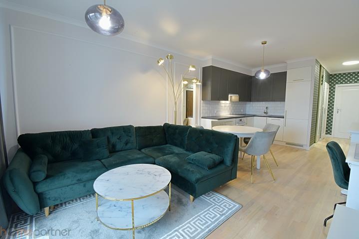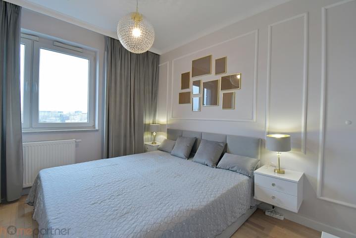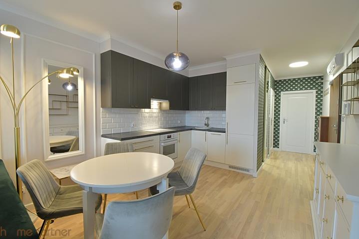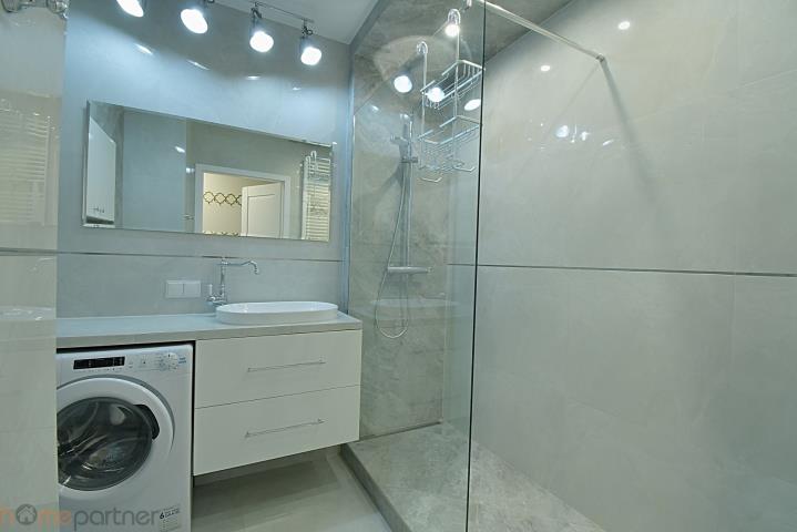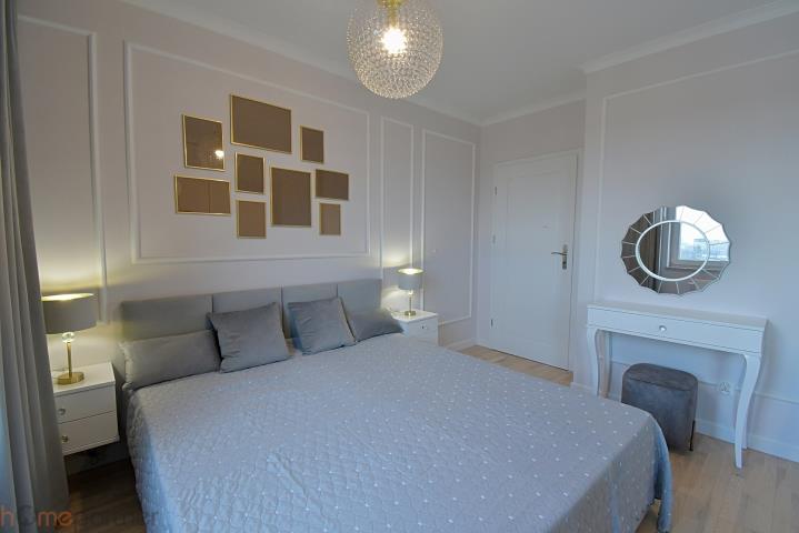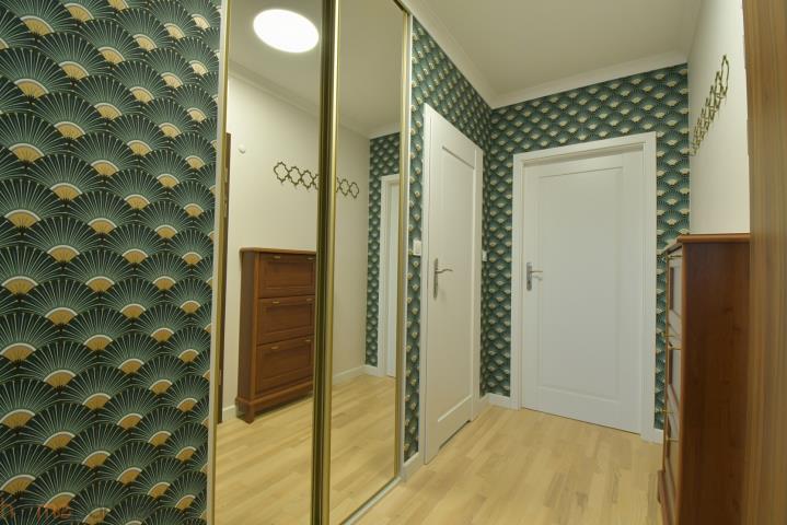 Mieszkanie jest umeblowane i nowocześnie zaaranżowane, wykończone materiałami wysokiej klasy. Kuchnia w zabudowie wyposażona w lodówko-zamrażarkę, płytę indukcyjną, piekarnik, okap oraz zmywarkę 40 cm. Salon kompletnie wyposażony: okrągły, rozkładany stół z czterema krzesłami, duży rozkładany narożnik, stolik kawowy, szafka RTV, biurko z krzesłem. Łazienka z kabiną typu walk-in, pralko-suszarka na wyposażeniu. W sypialni łóżko małżeńskie tzw. kontynentalne ze schowkiem na pościel, duża szafa w zabudowie, toaletka z lustrem, dwie szafki nocne z lampkami. W przedpokoju duża szafa, szafka na buty, siedzisko i videodomofon.