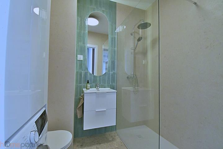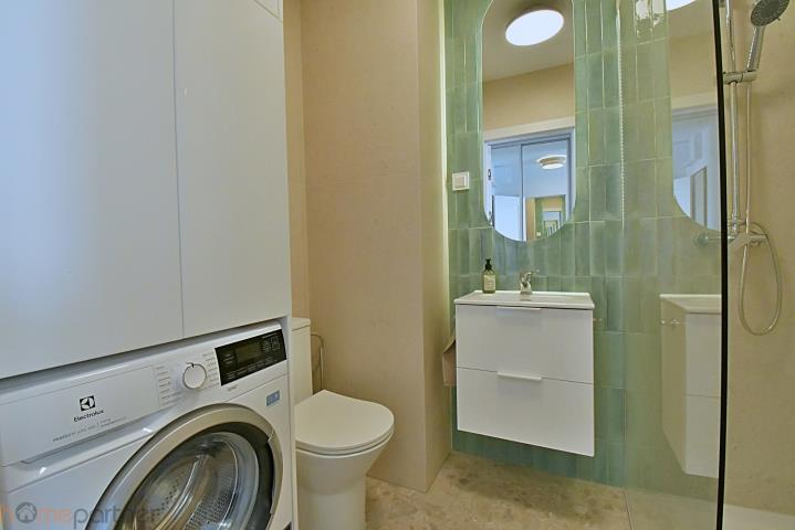 Piękna łazienka z prysznicem, pralka na wyposażeniu.