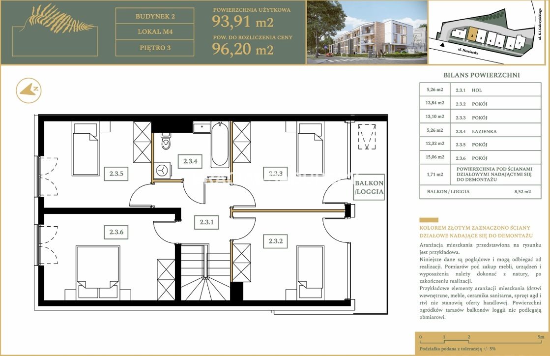 - piętro 3: hol (5,26 m2), 4 pokoje (15,06 m2, 13,10 m2, 12,84 m2, 12,32 m2), łazienka (5,26 m2), balkon (8,52 m2 - ekspozycja południowa).