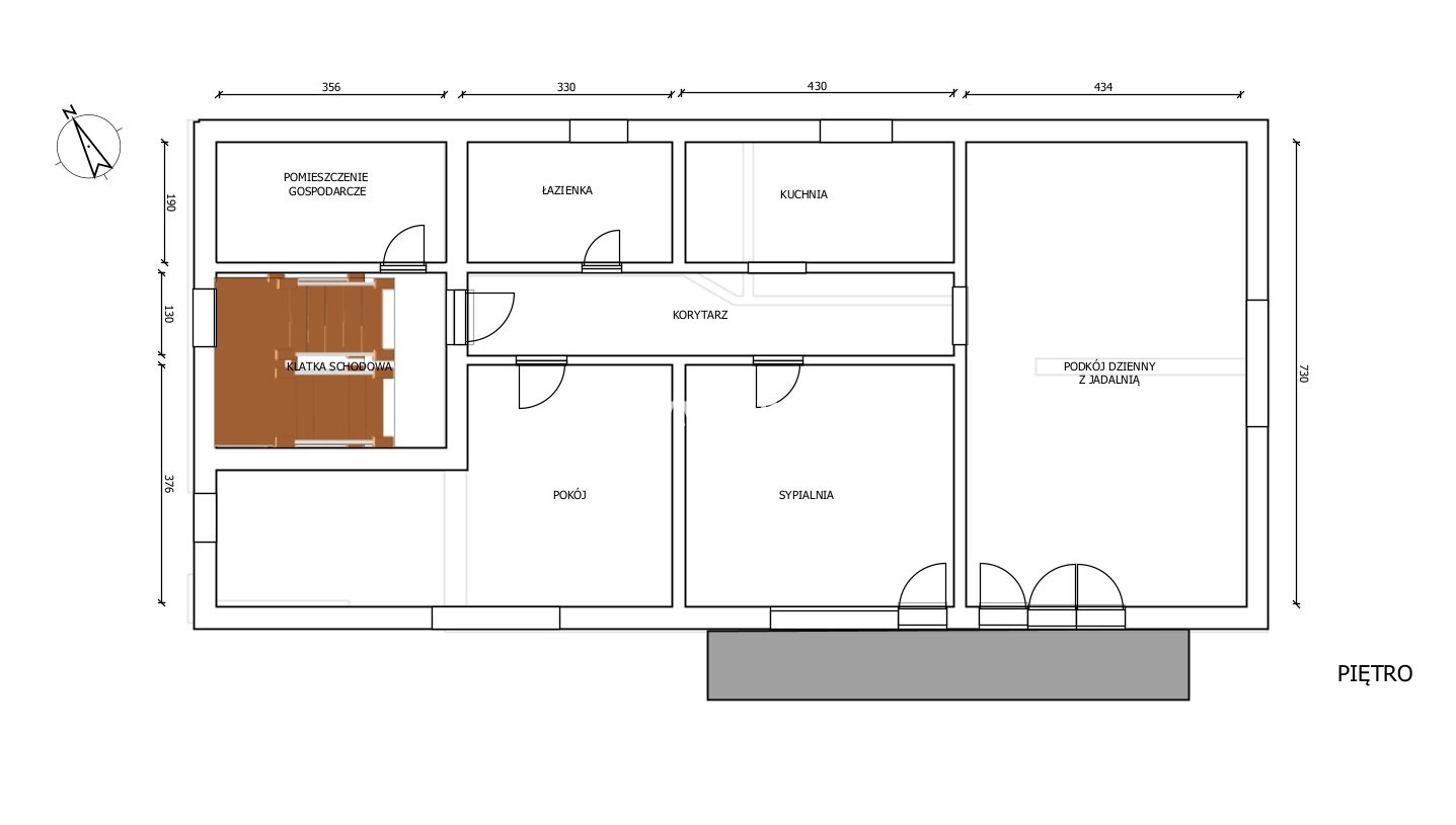 Na piętrze o pow. użytkowej 104,40 m2 wydzielono: salon z wyjściem na balkon, 2 pokoje, kuchnię, łazienkę, przedpokój oraz schowek.
