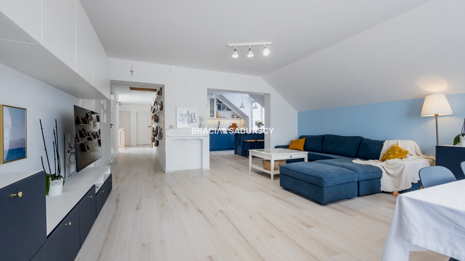 Część mieszkalna górnej kondygnacji składa się z kuchni ( 16 m 2 ) połączonej z obszernym salonem ( 32 m 2 ) z wyjściem na duży balkon z ekspozycją południową, trzech sypialni ( 16, 13, 13 m 2 ), łazienki ( 11 m 2 ), W.C. ( 2.5 m 2 ), garderoby ( 7.5 m 2 ) oraz przedpokoju ( 11 m 2 ). Na parterze znajdziemy wiatrołap ( 2.5 m 2 ), przedpokój ( 19 m 2 ), komunikacja - schody ( 7 m 2 ).