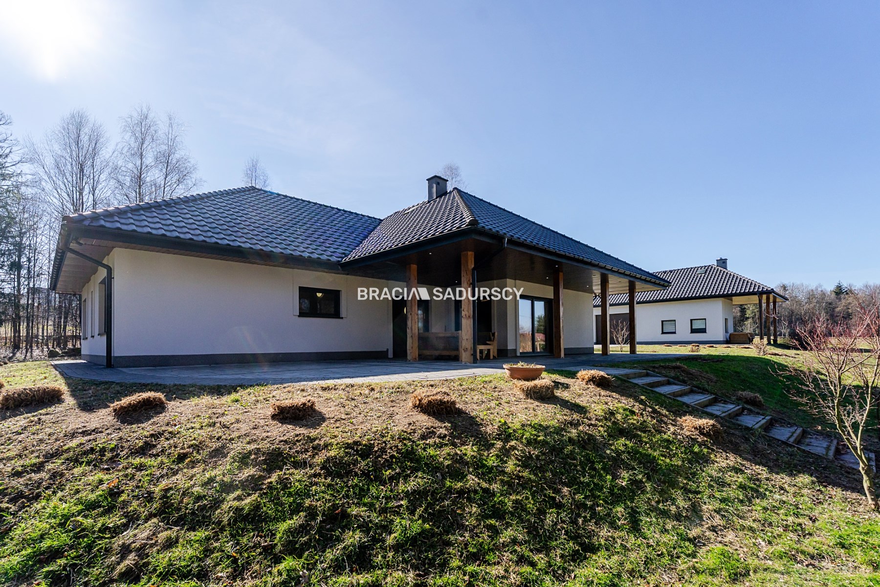 Nowoczesny dom parterowy 208 m² na działce 1,38 ha z sadem, prywatnym lasem, oczkiem wodnym i dodatkowymi budynkami.