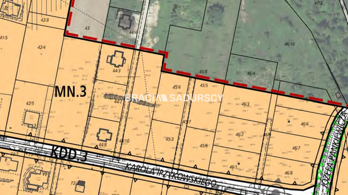 Nowa Huta, Łuczanowice, ul. Irzykowskiego. Działka budowlana o powierzchni 1000m2 w drugiej linii zabudowy. Nieruchomość na obrzeżach miasta, w sąsiedztwie nowe domy. Działka płaska, w kształcie prostokąta. Wymiary długość 40 m, szerokość 25 m. Swoim szerszym bokiem przylega do prywatnej utwardzonej drogi. Kupujący wraz z działką nabywa udziały w drodze dojazdowej. Działka świetnie nasłoneczniona. Teren zlokalizowany jest w cichej okolicy, z dala od głównej drogi co stwarza idealne warunki do odpoczynku. W najbliższym sąsiedztwie są nowo wybudowane rezydencje lub będące w budowie nowe domy, oraz pola niezabudowane. Działka idealna jako inwestycja. Po wykonaniu poszerzenia drogi, chodników i doprowadzeniu kanalizacji oraz przedłużeniu wodociągu jej wartość będzie rosła.