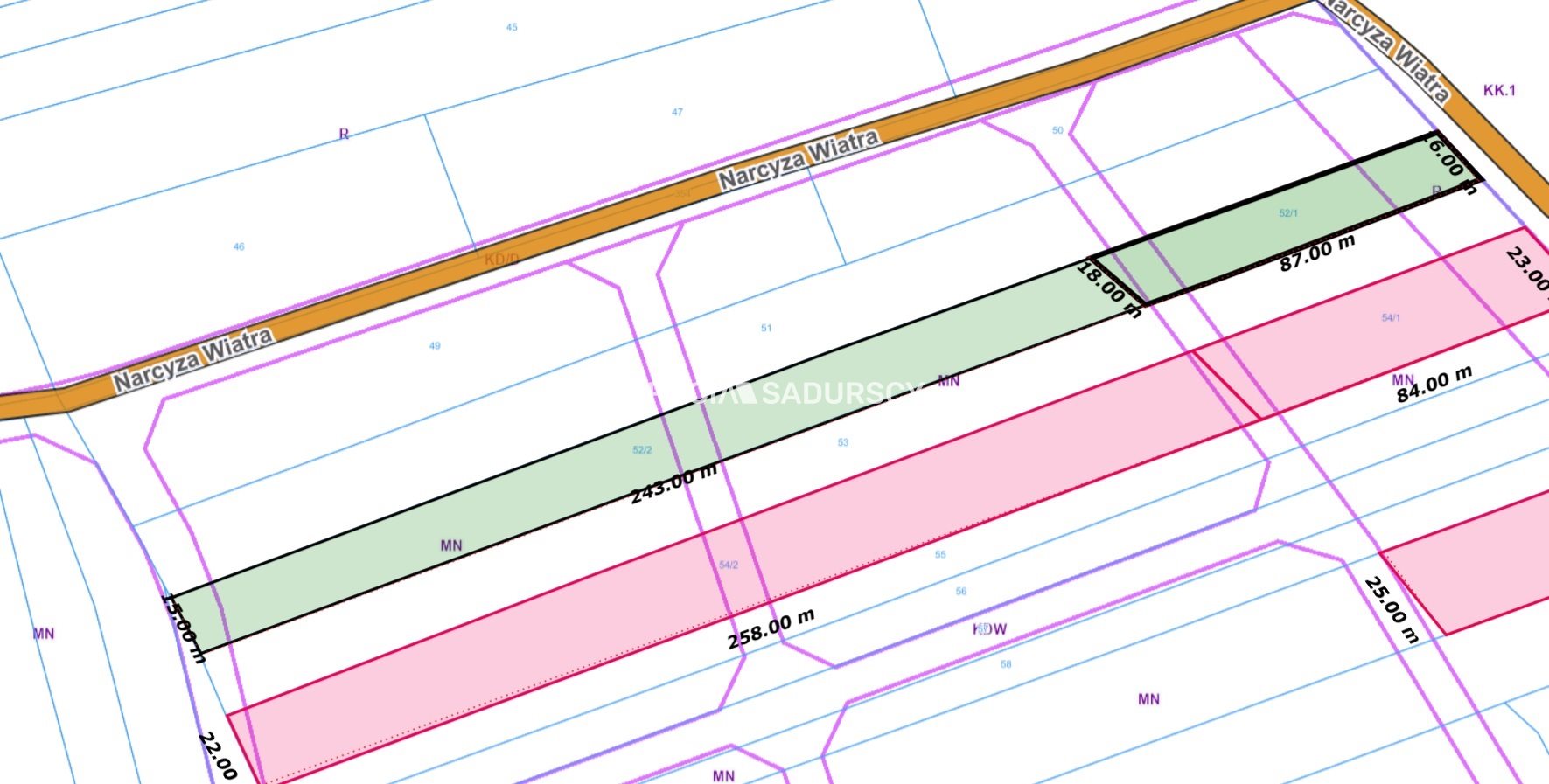 Działka ma powierzchnię wynoszącą 3704 m2 , jest objęta ustaleniami miejscowego planu zagospodarowania przestrzennego i składa się z części terenu pod zabudowę mieszkaniową jednorodzinną MN ( 3380 m2 ) i terenu komunikacji KD (324 m2).