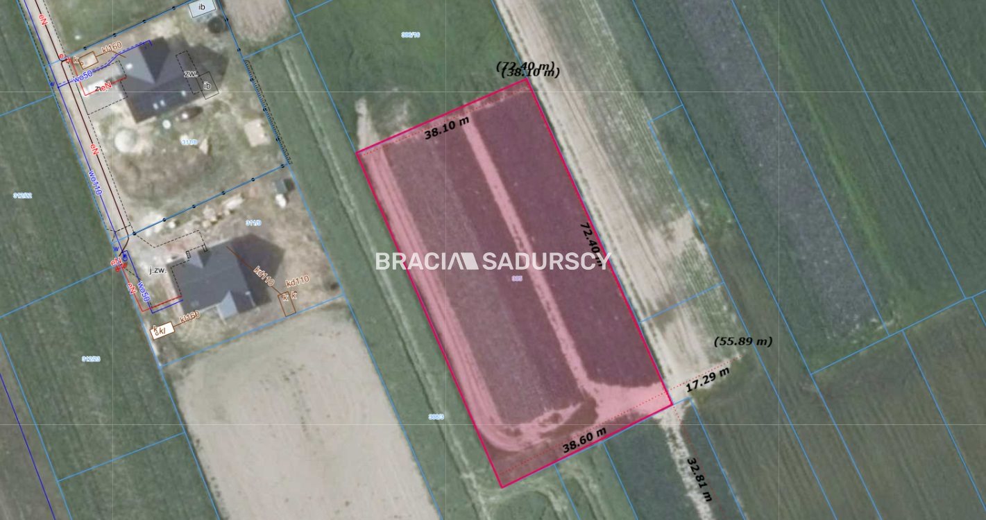 Działka o powierzchni 2829 m 2 i wymiarach 38x72 m . Działka niezabudowana, płaska, niezadrzewiona.