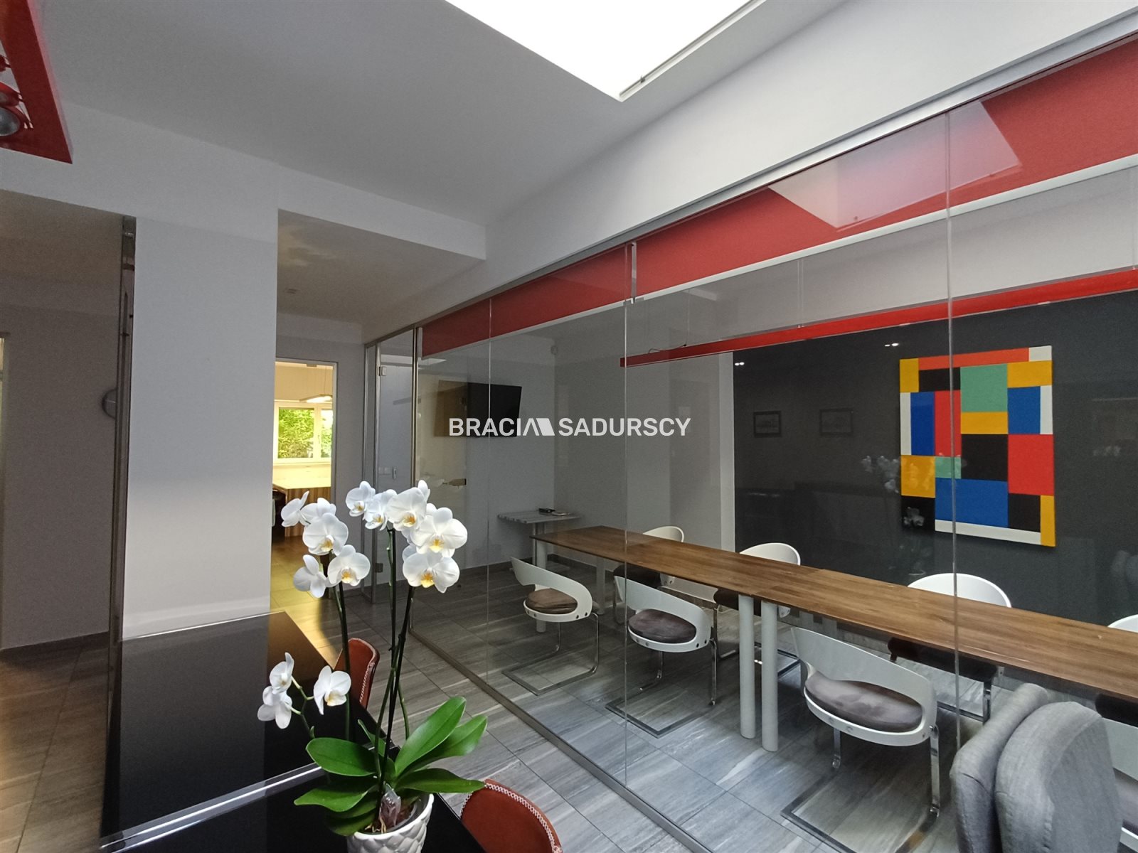 przeszklona sala konferencyjna z ekranem i pełnym umeblowaniem,