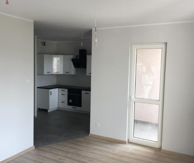 -salon z aneksem kuchennym: 23,91 m2. Na podłodze gres w części kuchennej, panele w części pokojowej..