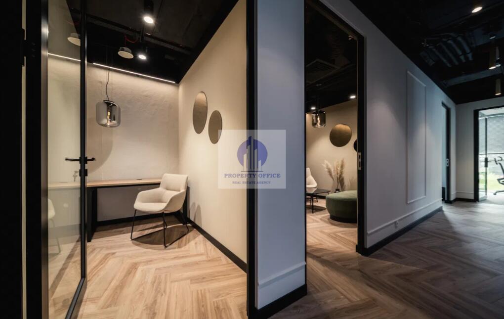 Biuro z gotowymi stanowiskami pracy, wyposażony w biurka, krzesła i szafki.