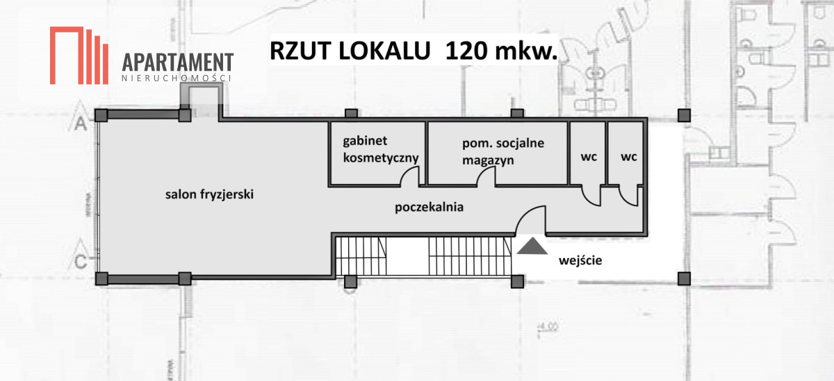 • Układ: główna sala open space, idealna do aranżacji z sześcioma stanowiskami fryzjerskimi, miejscami do mycia włosów, stanowiskami do manicure oraz poczekalnią dla klientów i recepcją;