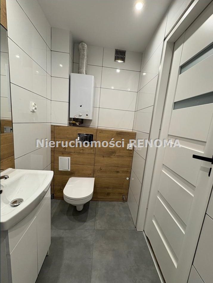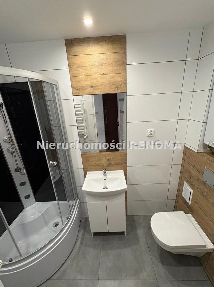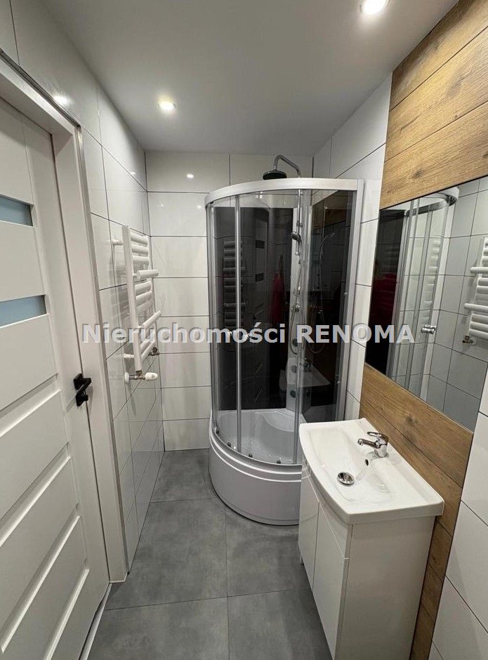 Łazienka w całości wykończona nowymi kaflami i wyposażona w kabinę prysznicową, umywalkę z szafką oraz nowe drzwi.
