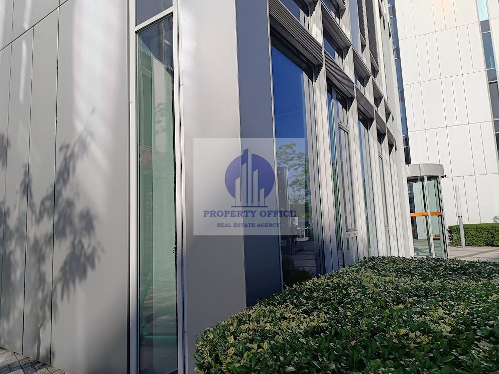 Okna lokalu wychodzą na dziedziniec kompleksu biurowego.