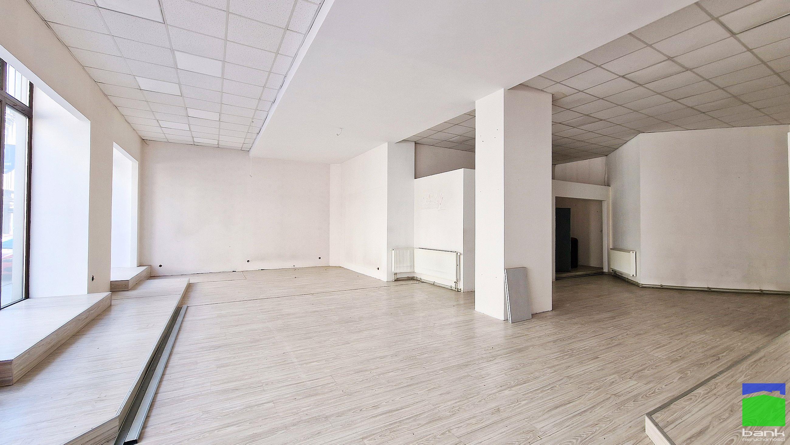 Duże witryny i wejście bezpośrednio z ulicy. Lokal położony częściowo na parterze oraz