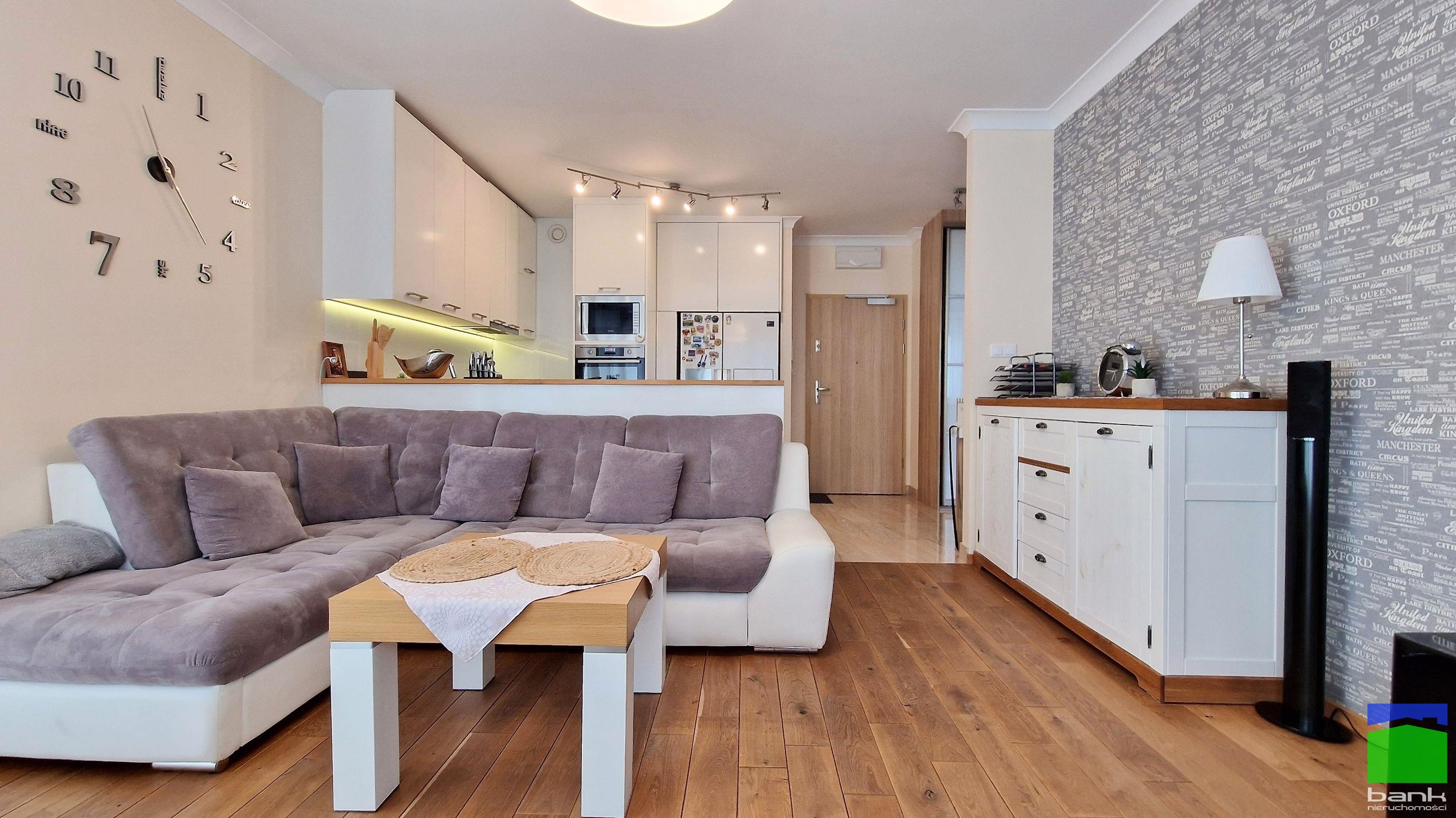 - przestronnego salonu z aneksem kuchennym (24,59 m2), podłogi dębowe
