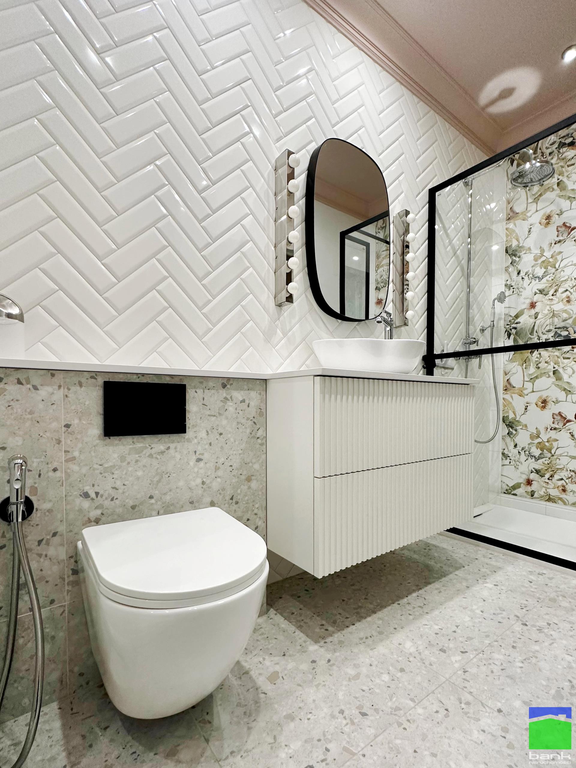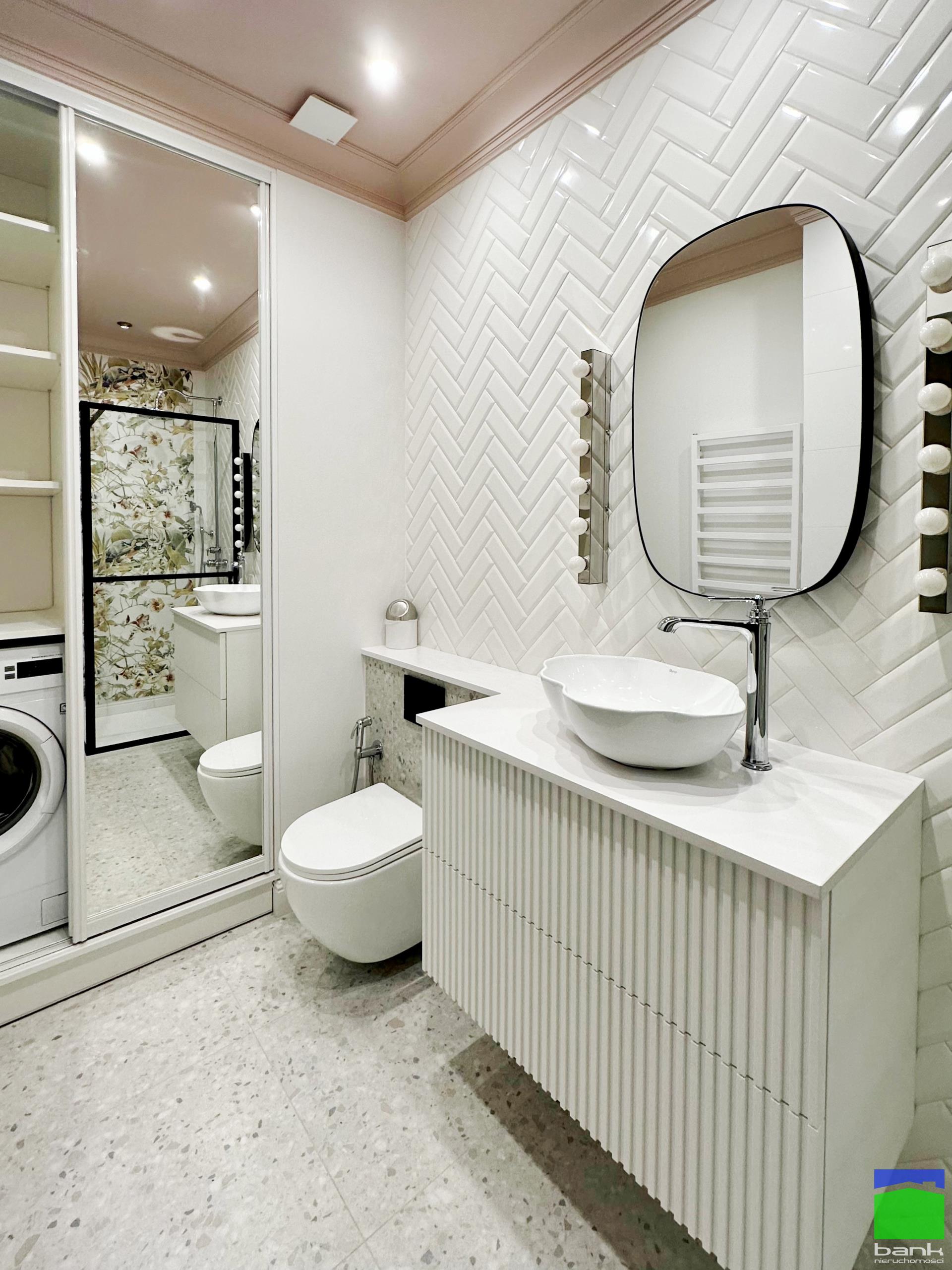 Łazienka z prysznicem typu walk-in (przesuwna szafa z lustrem, pralka).