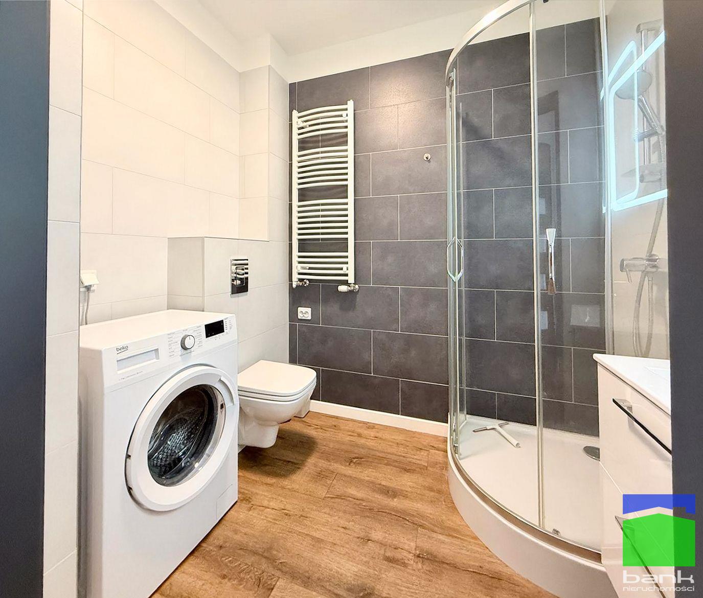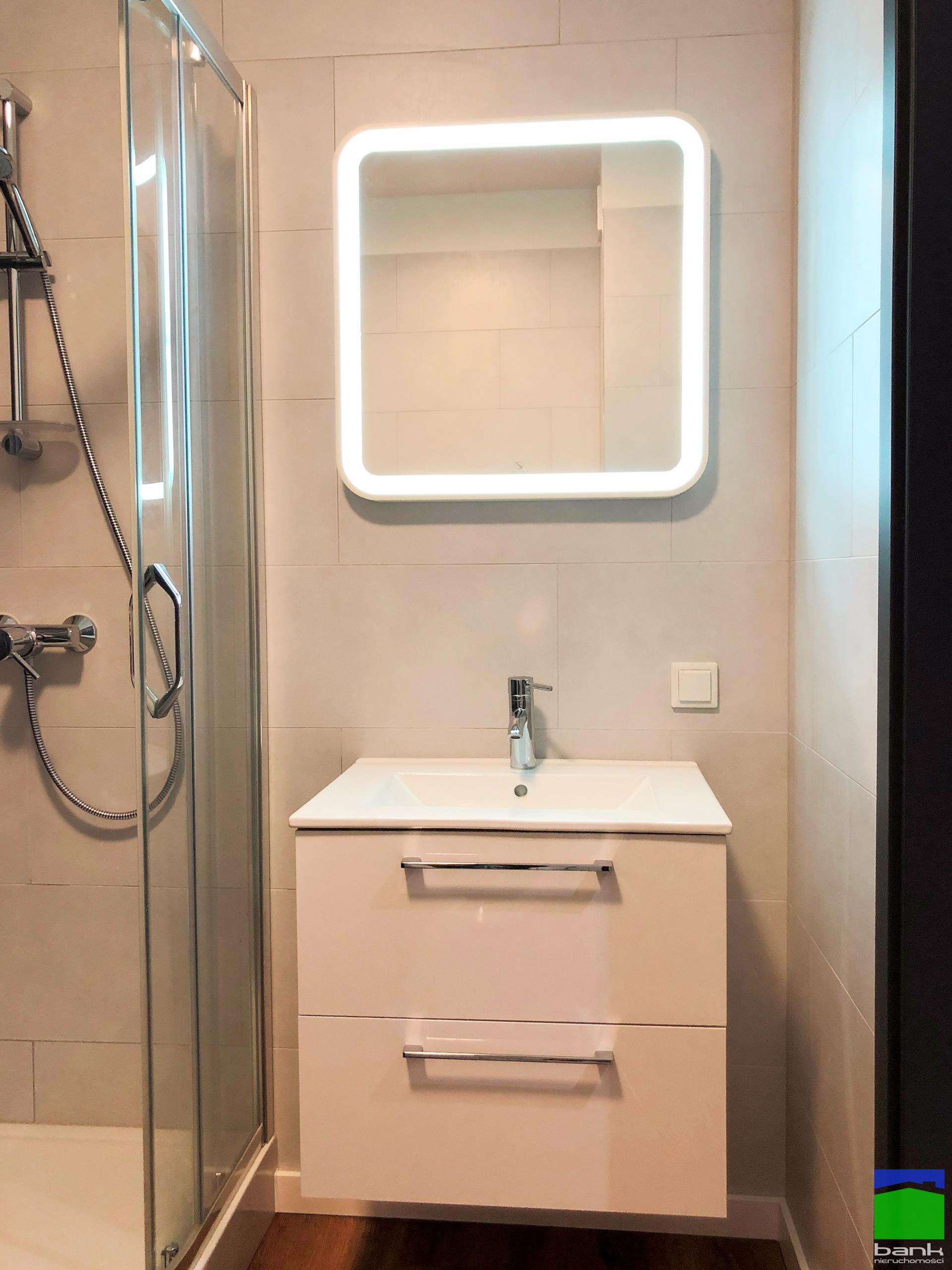 Łazienka z kabiną prysznicową. Przedpokój z dużą szafą w zabudowie.