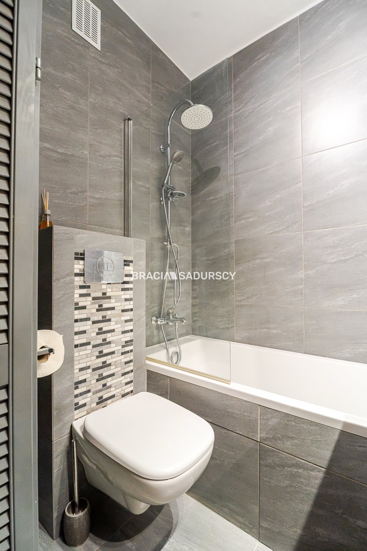 Łazienka z wanną, w szarej ponadczasowej kolorystyce.