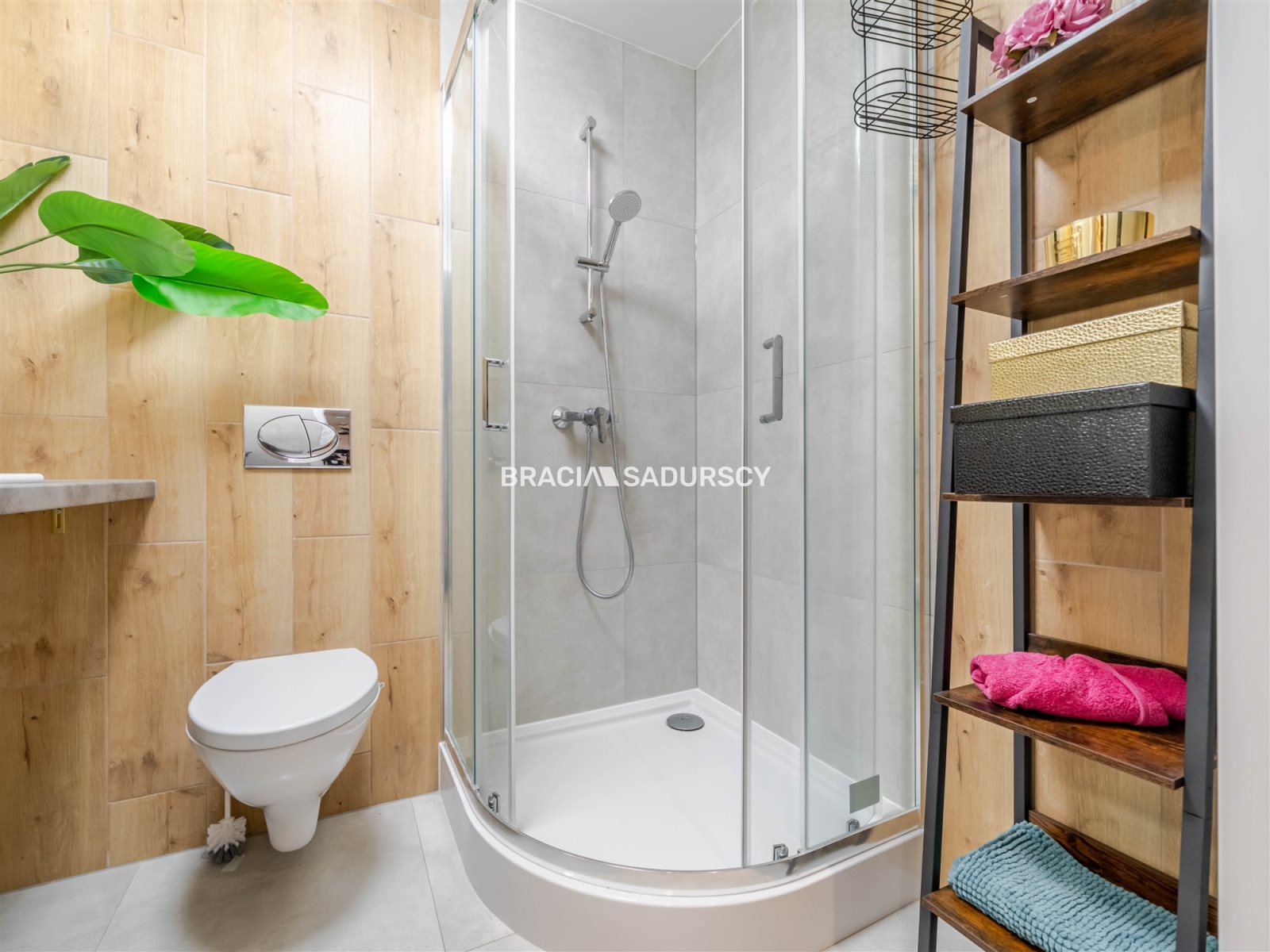- łazienka z kabiną prysznicową i WC w zabudowie.