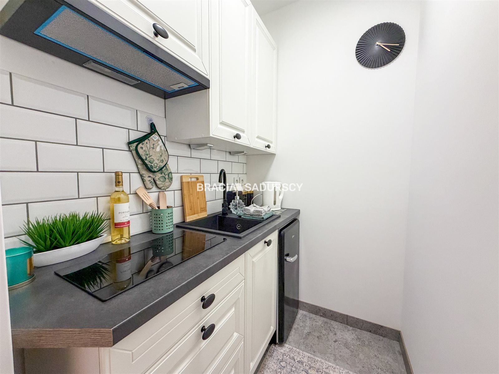 - oddzielna, nowoczesna kuchnia wyposażona w płytę indukcyjną, okap oraz lodówkę w stylu retro,