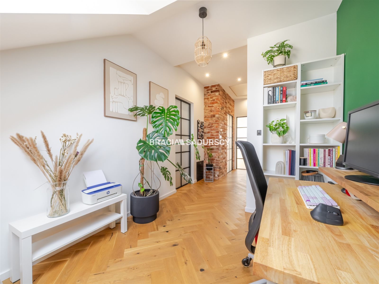 Wyższa kondygnacja stanowi strefę prywatną, sprzyjającą odpoczynkowi. Znajdują się tu trzy ustawne i jasne pokoje oraz przestronna, elegancka łazienka z ogrzewaniem podłogowym. Dodatkowym atutem jest dostęp do strychu, który można zagospodarować według własnych potrzeb. W holu oraz sypialni głównej zamontowano klimatyzatory.