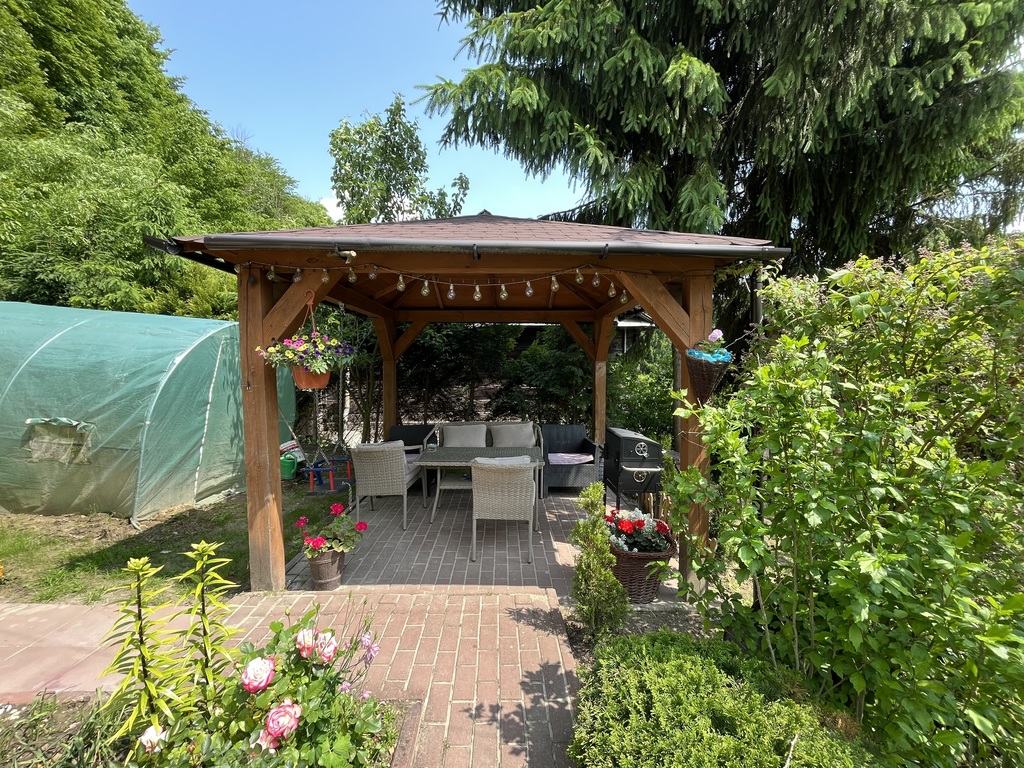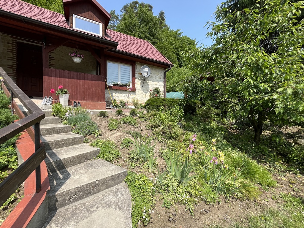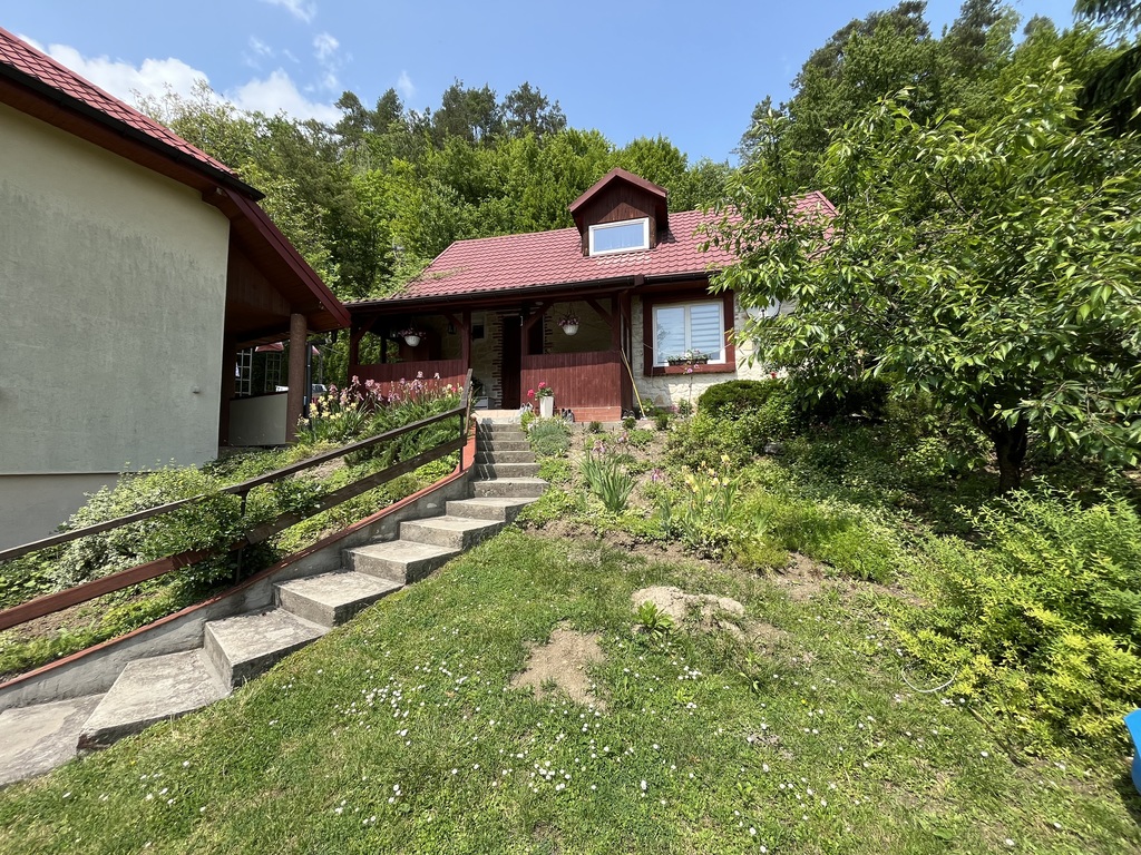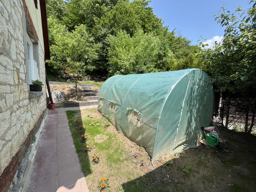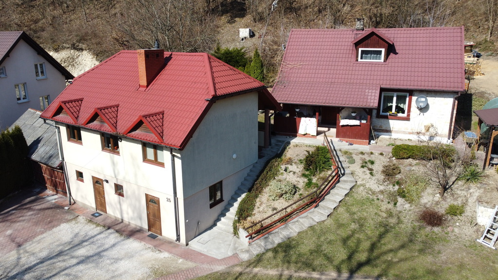 - drogi dom w chwili obecnej wykorzystywany jako mieszkalny właścicieli ma pow. 75 m2. W jego skład wchodzi parter z tarasem przy drzwiach wejściowych o pow. 11 m2, przedpokoju o pow. 2,7 m2, , łazienki o pow. 2,2 m2, kuchni o pow. 11,2 m2 oraz dużego pokoju o pow. 25 m2. W kuchni znajduje się piec kaflowy który jednocześnie jest źródłem ogrzewania w całym domu (rozprowadzone centralne ogrzewanie). Na piętrze znajduje się korytarz oraz dwa pokoje o pow. 11,4 m2 i 13,3 m2. Dom też może być wykorzystywany również pod wynajem. Obok domu znajduje się drewniana altana do odpoczynku. Za domem mamy teren i drogę do wąwozu na którym można rozpalić ognisko.