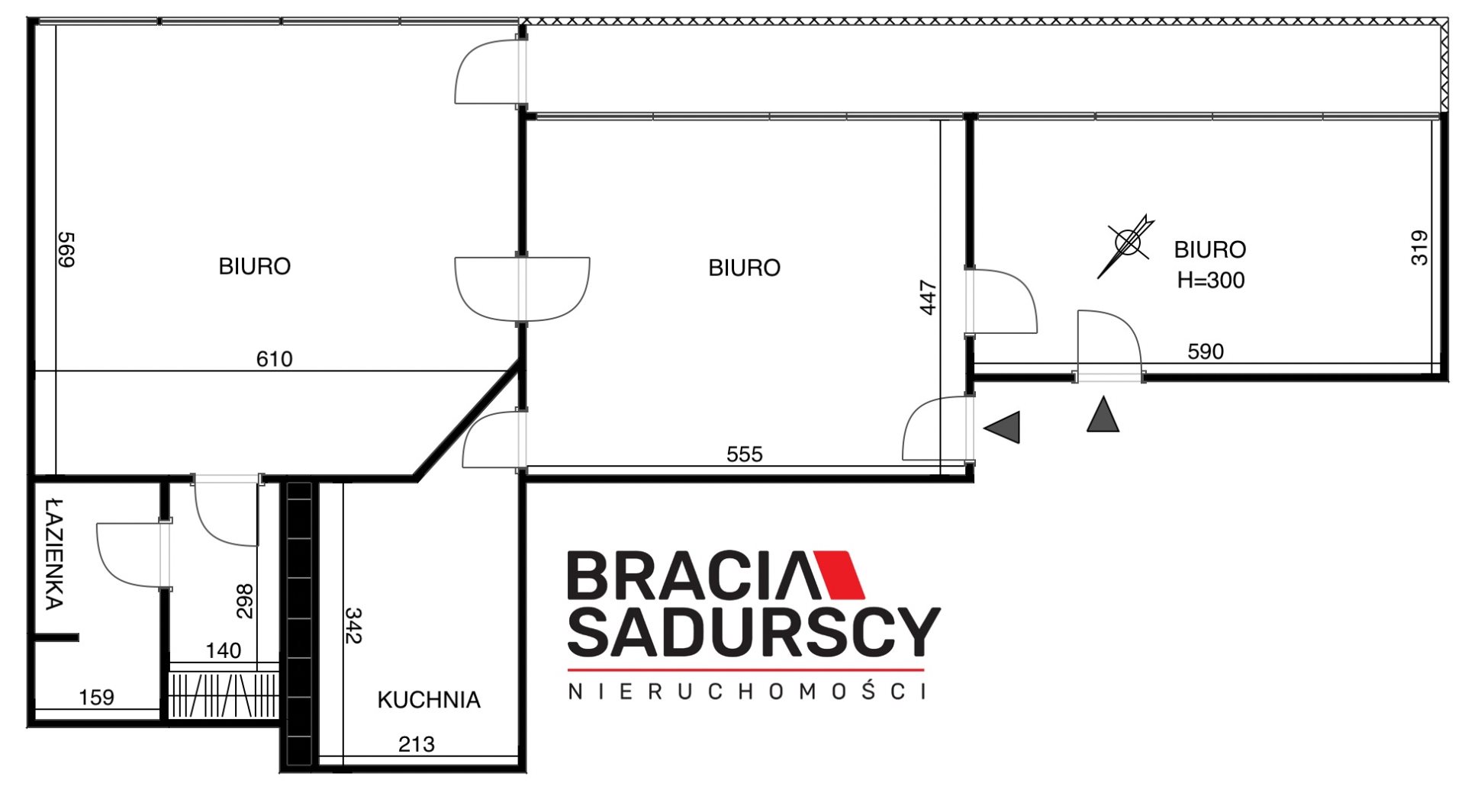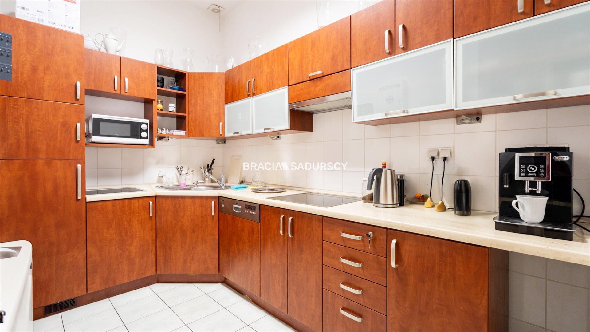 Rozkład pomieszczeń: Biuro składa się z 3 przestronnych pokoi biurowych, które zapewniają odpowiednią przestrzeń do pracy. Dodatkowo, do dyspozycji najemcy znajduje się w pełni wyposażona kuchnia, komfortowa toaleta oraz funkcjonalna garderoba. Pomieszczenia charakteryzują się eleganckim wykończeniem, a na podłodze znajduje się wykładzina dywanowa, parkiet oraz gres, co zapewnia zarówno estetykę, jak i łatwość w utrzymaniu czystości.