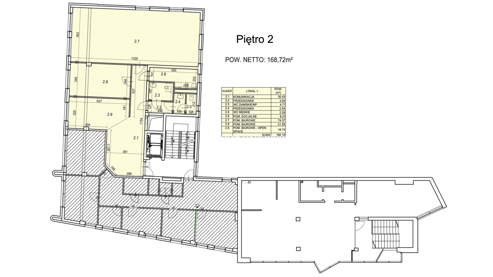Lokal o powierzchni 168 m² składa się z 5 przestronnych pomieszczeń biurowych, kuchni oraz toalety. Powierzchnia biur waha się od 28 m² do 38 m², co daje dużą elastyczność w aranżacji przestrzeni. Istnieje również możliwość wynajęcia dodatkowych powierzchni w budynku.