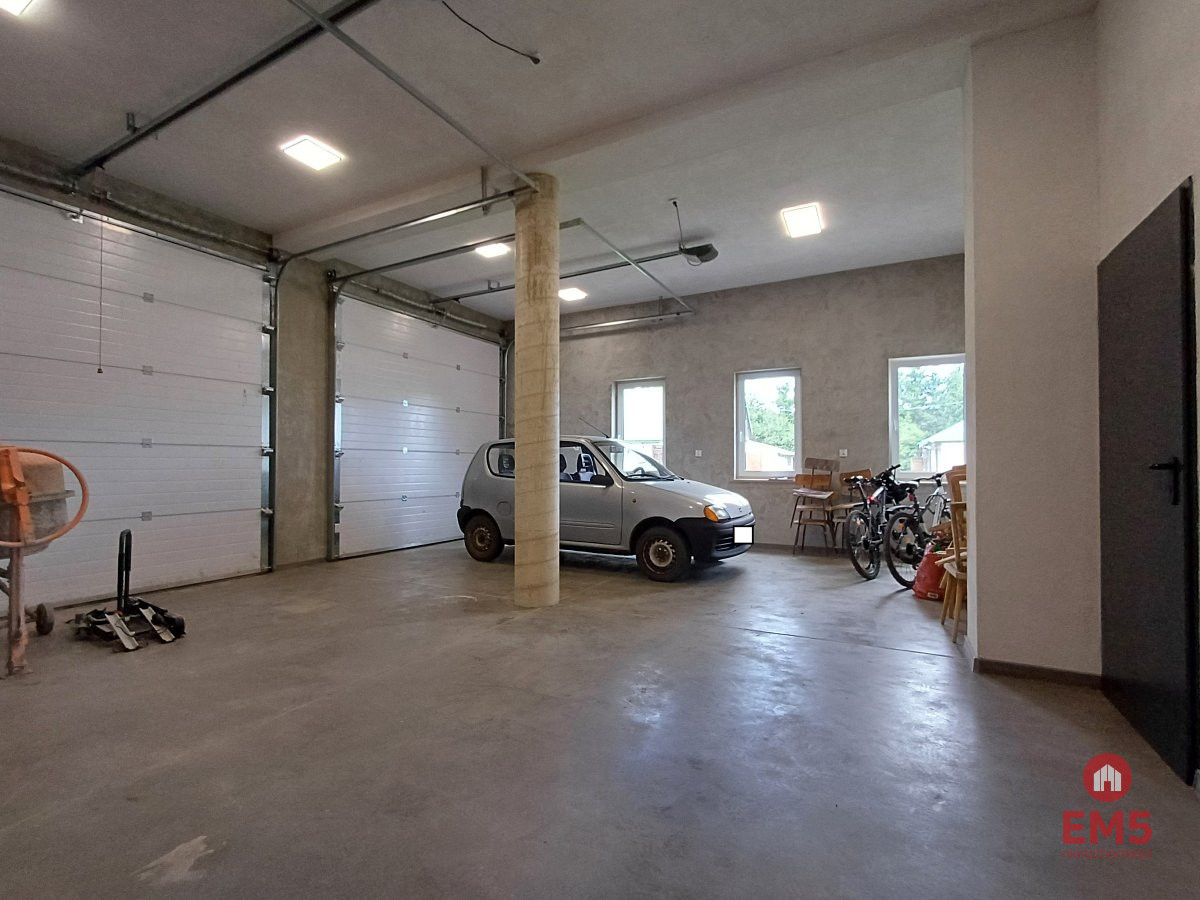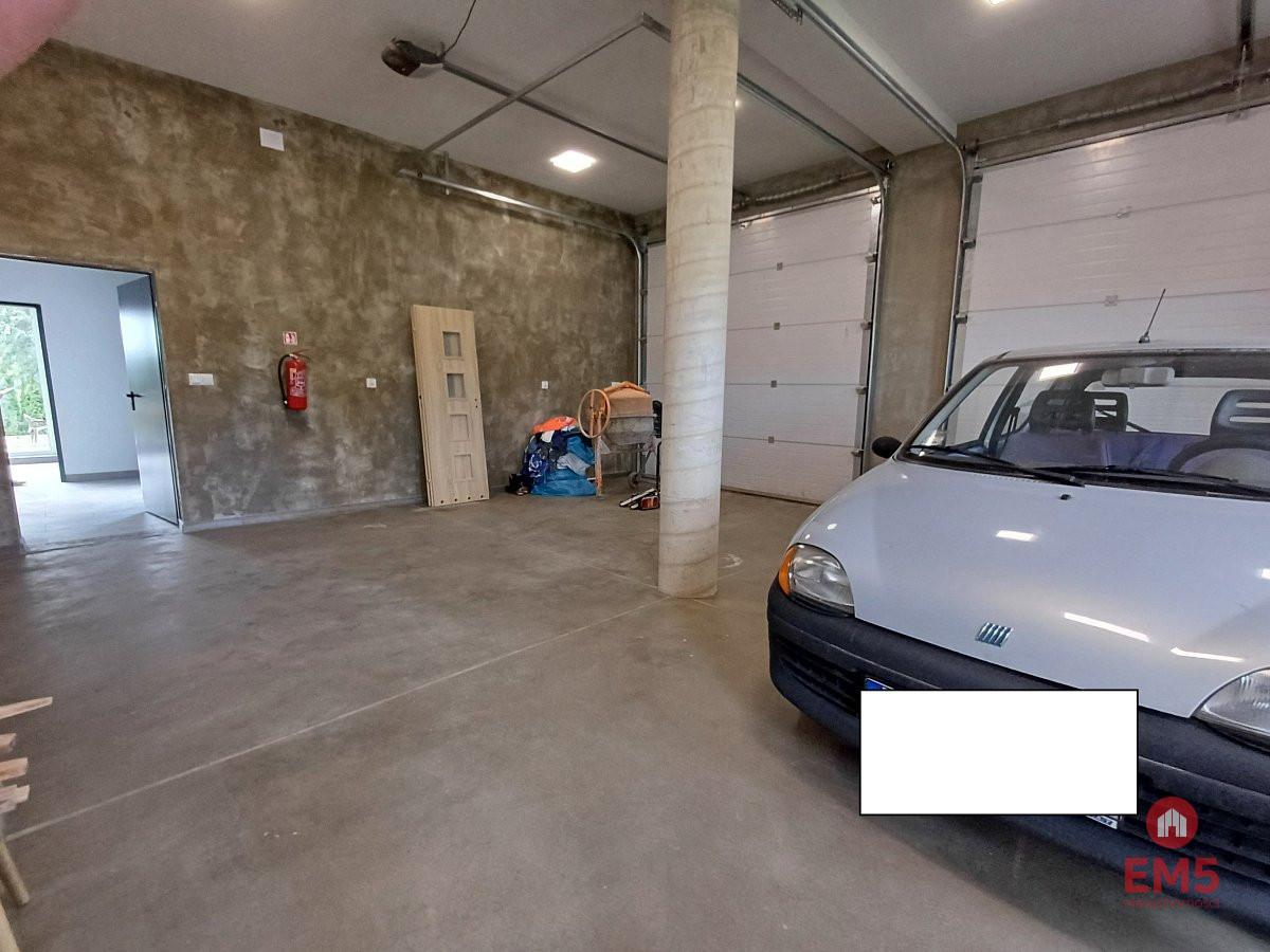 Garaż w bryle budynku. Dwie wysokie automatyczne bramy umożliwiają wjazd wysokim pojazdom typu bus.