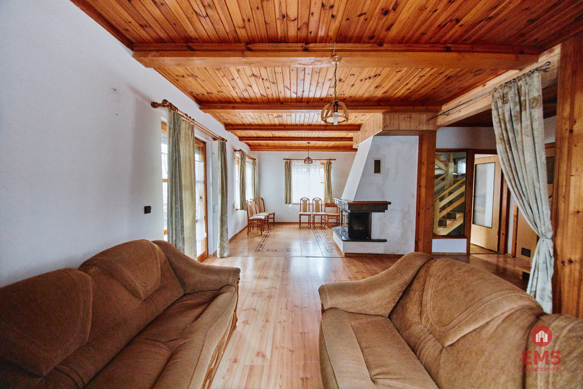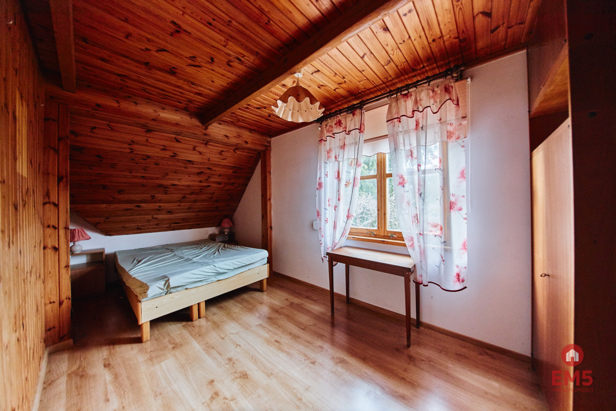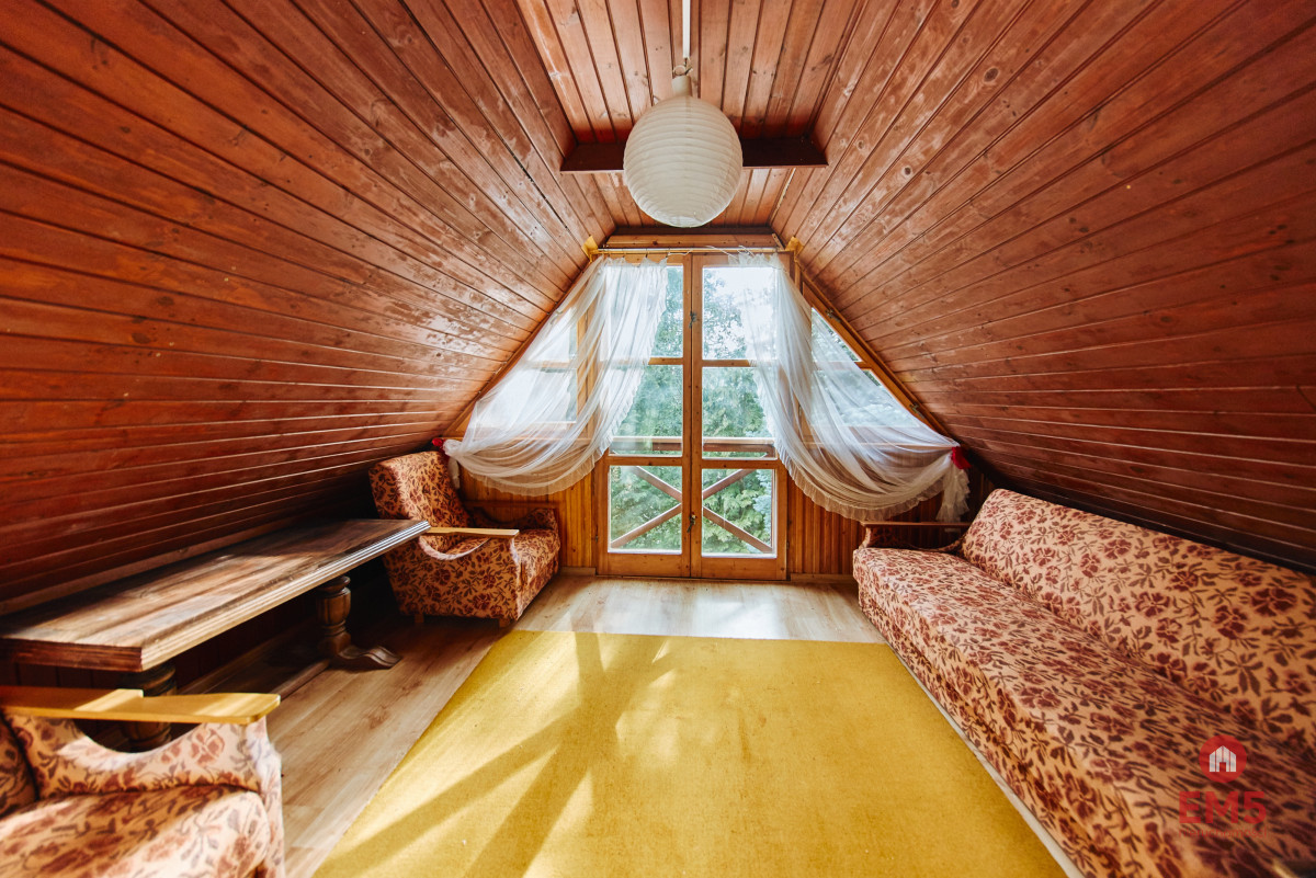 ROZKŁAD POMIESZCZEŃ: Parter:Duży, jasny salon z kominkiem i aneksem kuchennym, WC, wejście do piwnicy z sauną i garażem. Poddasze:2 sypialnie z podwójnymi łóżkami, 2 pokoje rekreacyjne (z możliwością adaptacji na dodatkowe sypialnie), łazienka z wanną i WC.