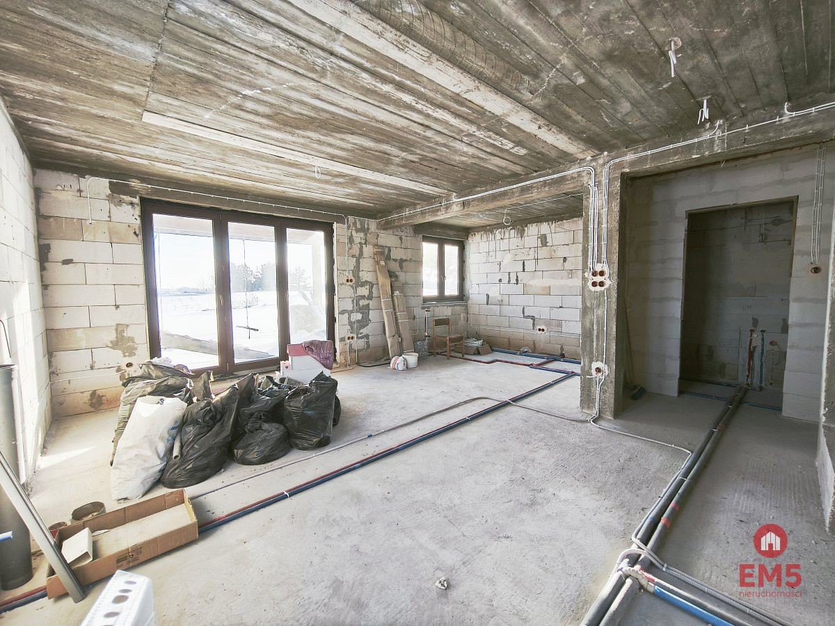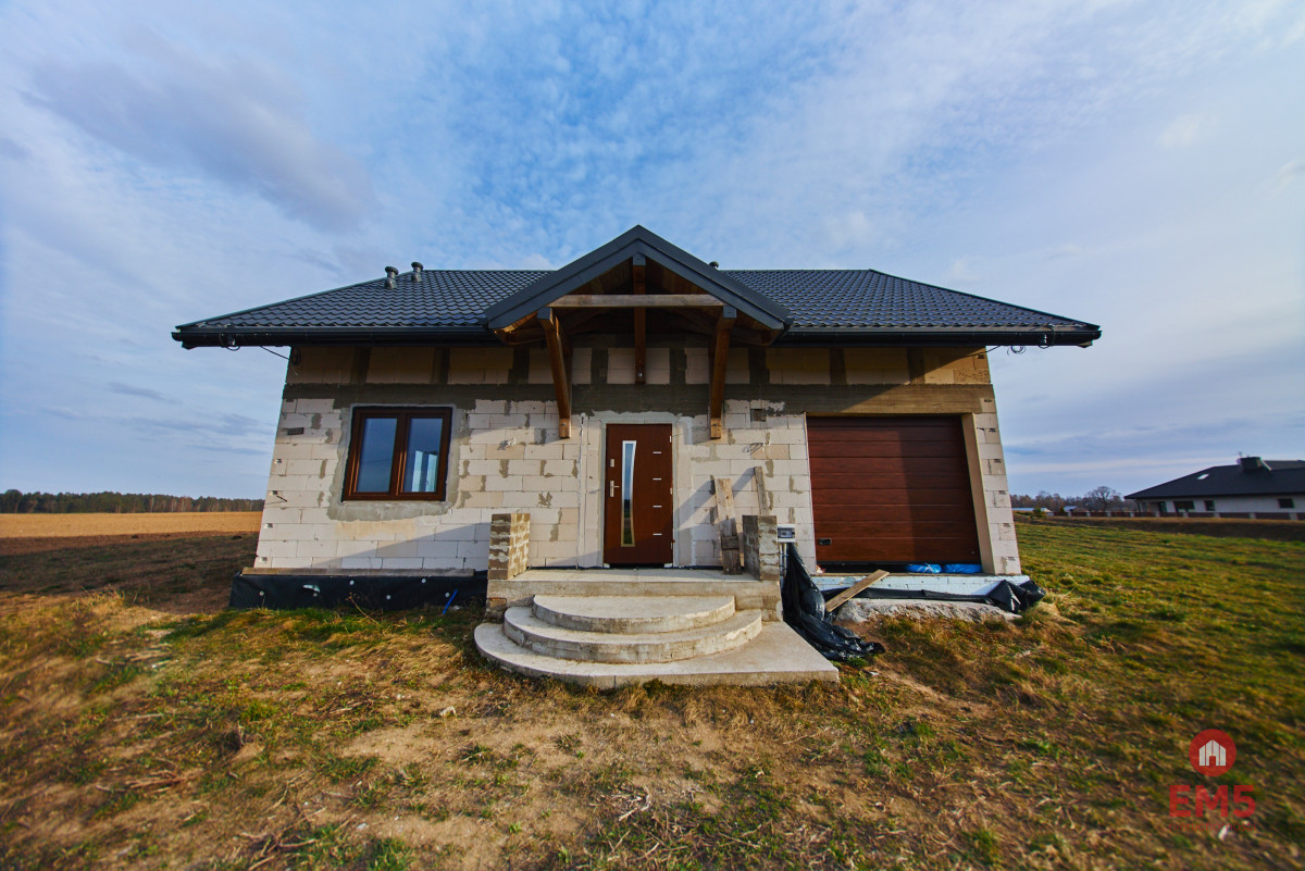 Dodatkowe atuty: zamontowane trzyszybowe okna PCV, parapety na wymiar - gotowe do montażu, w pełni przygotowana instalacja elektryczna (wewnątrz i na zewnątrz), instalacja trójfazowa w kuchni, wyprowadzona instalacja oświetlenia wewnętrznego, zewnętrznego oraz schodów prowadzących na piętro